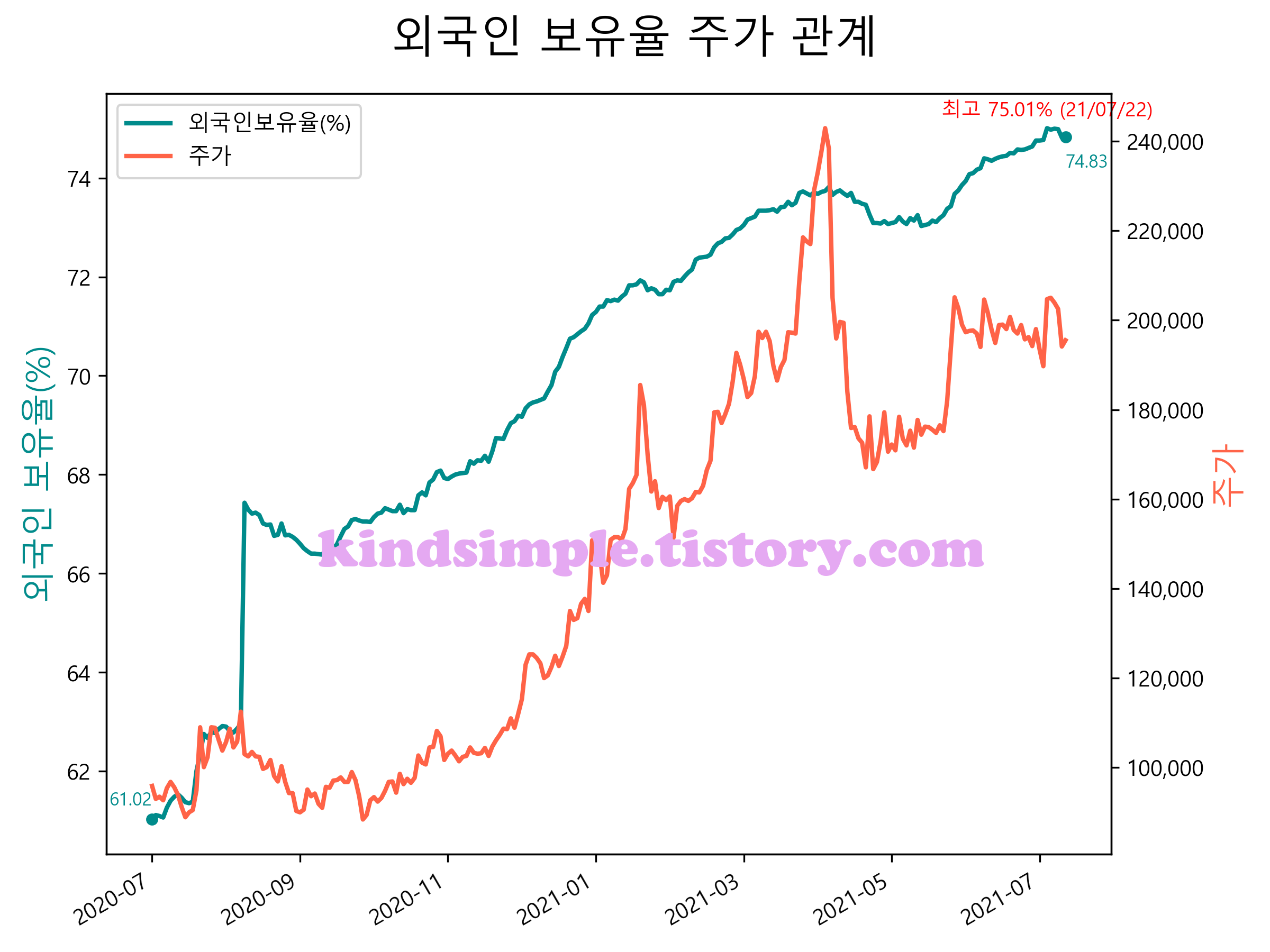 최근 1년간 외국인 보유율 및 주가와의 관계입니다.