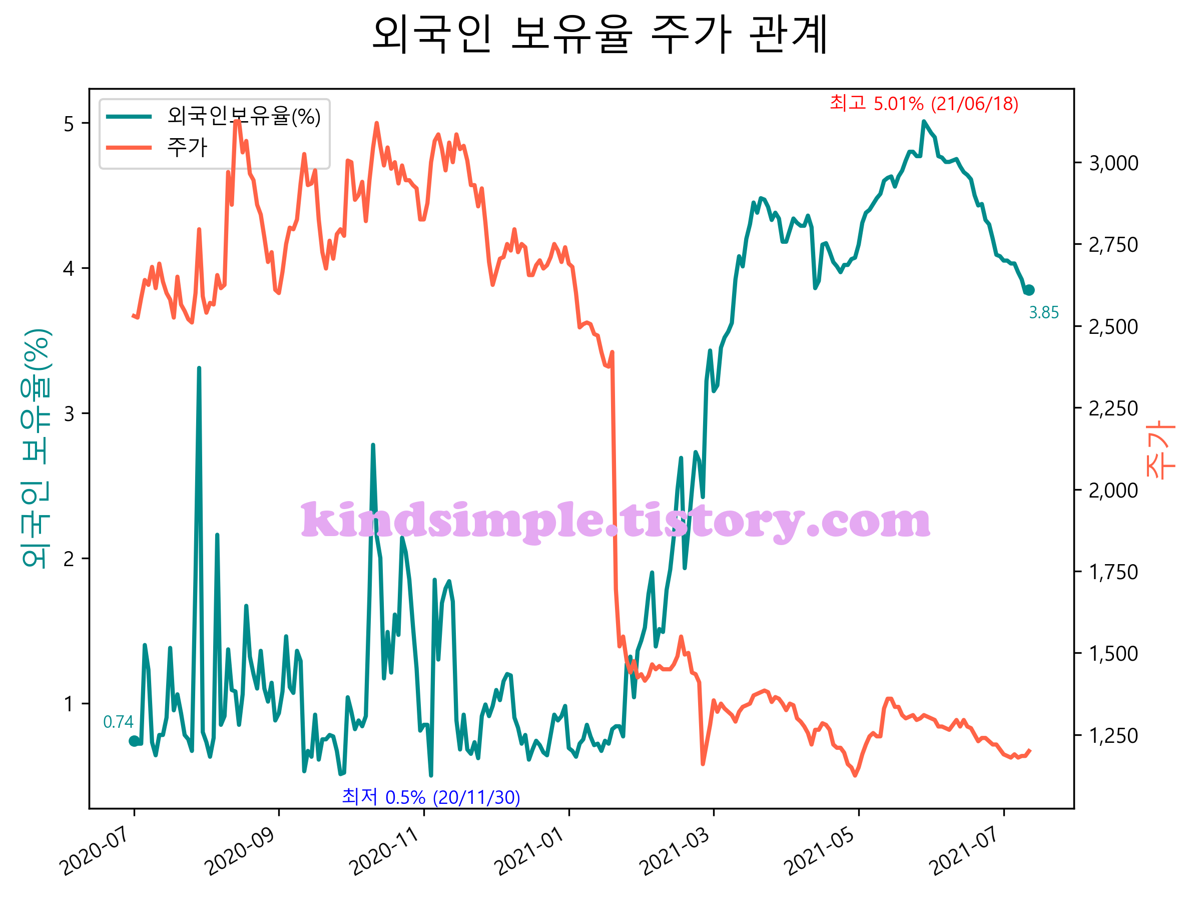 최근 1년간 외국인 보유율 및 주가와의 관계입니다.