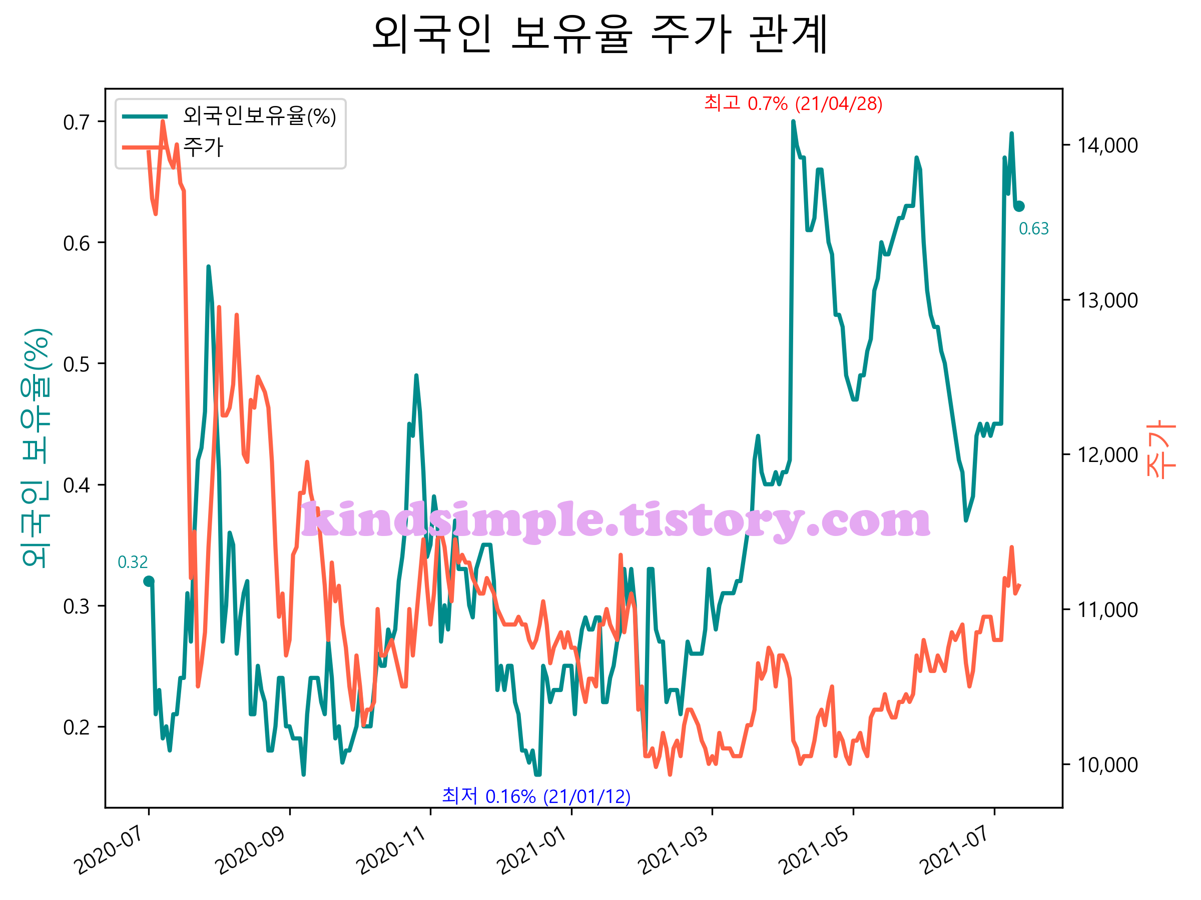 최근 1년간 외국인 보유율 및 주가와의 관계입니다.