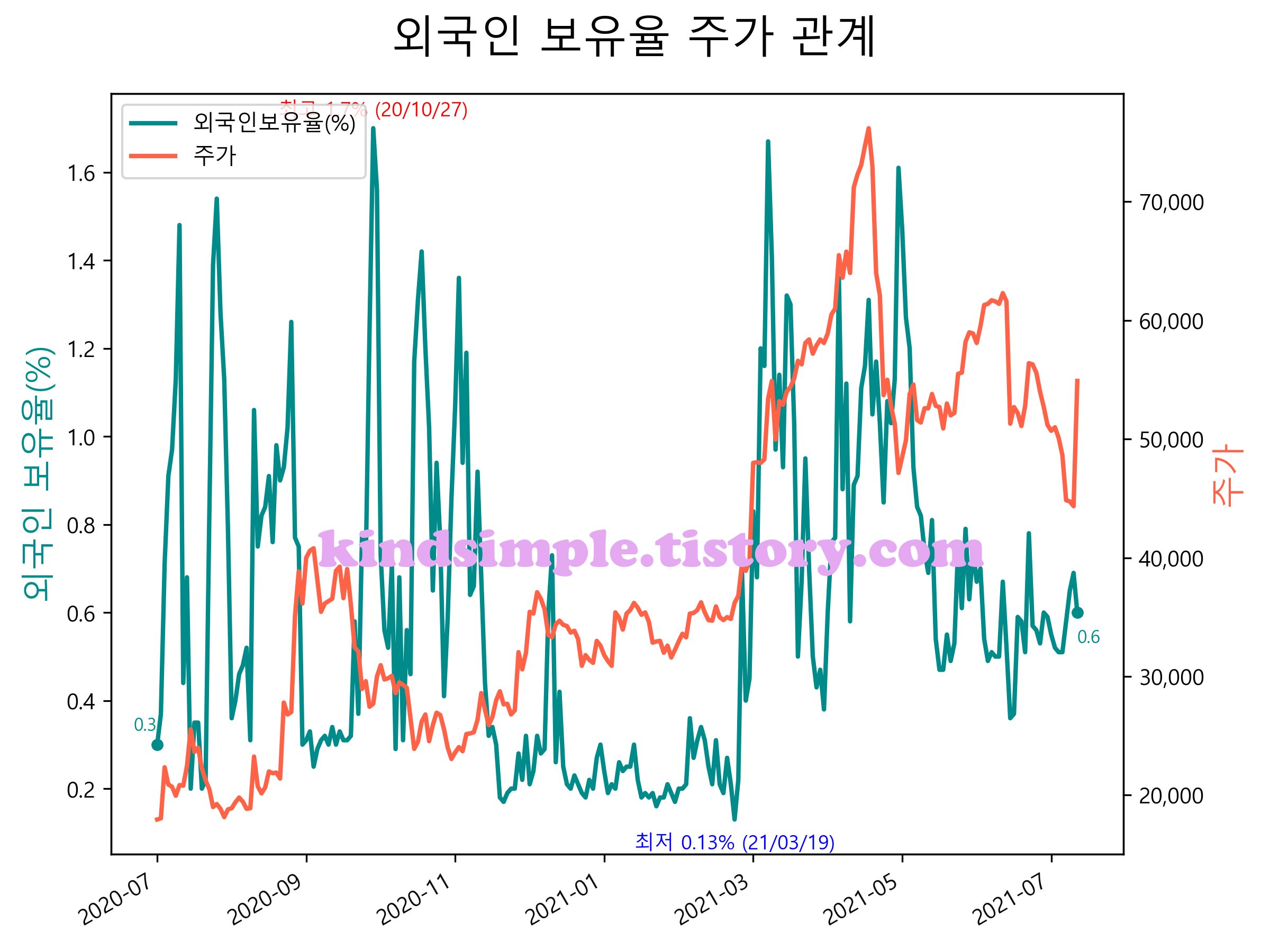 최근 1년간 외국인 보유율 및 주가와의 관계입니다.