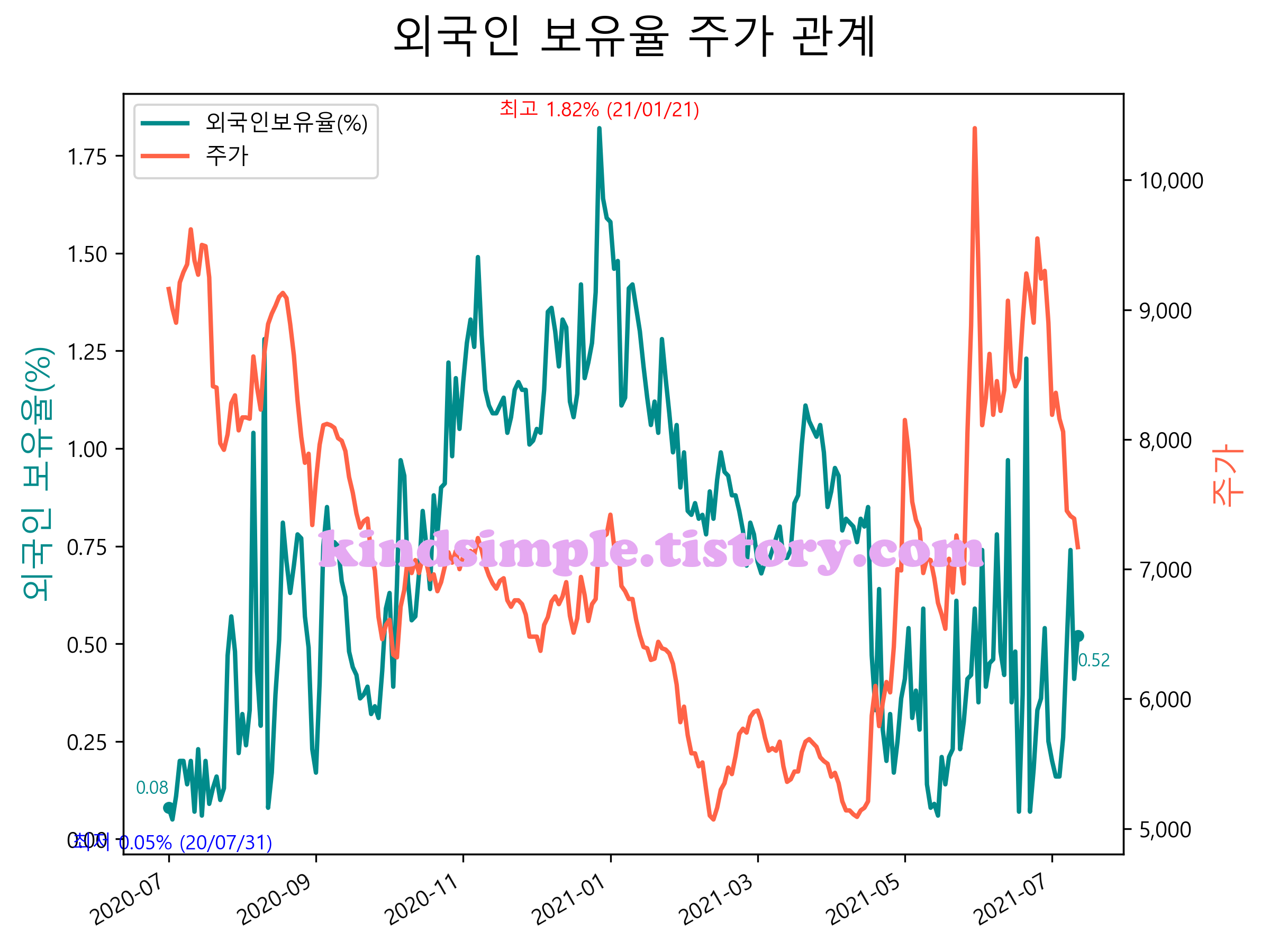 최근 1년간 외국인 보유율 및 주가와의 관계입니다.