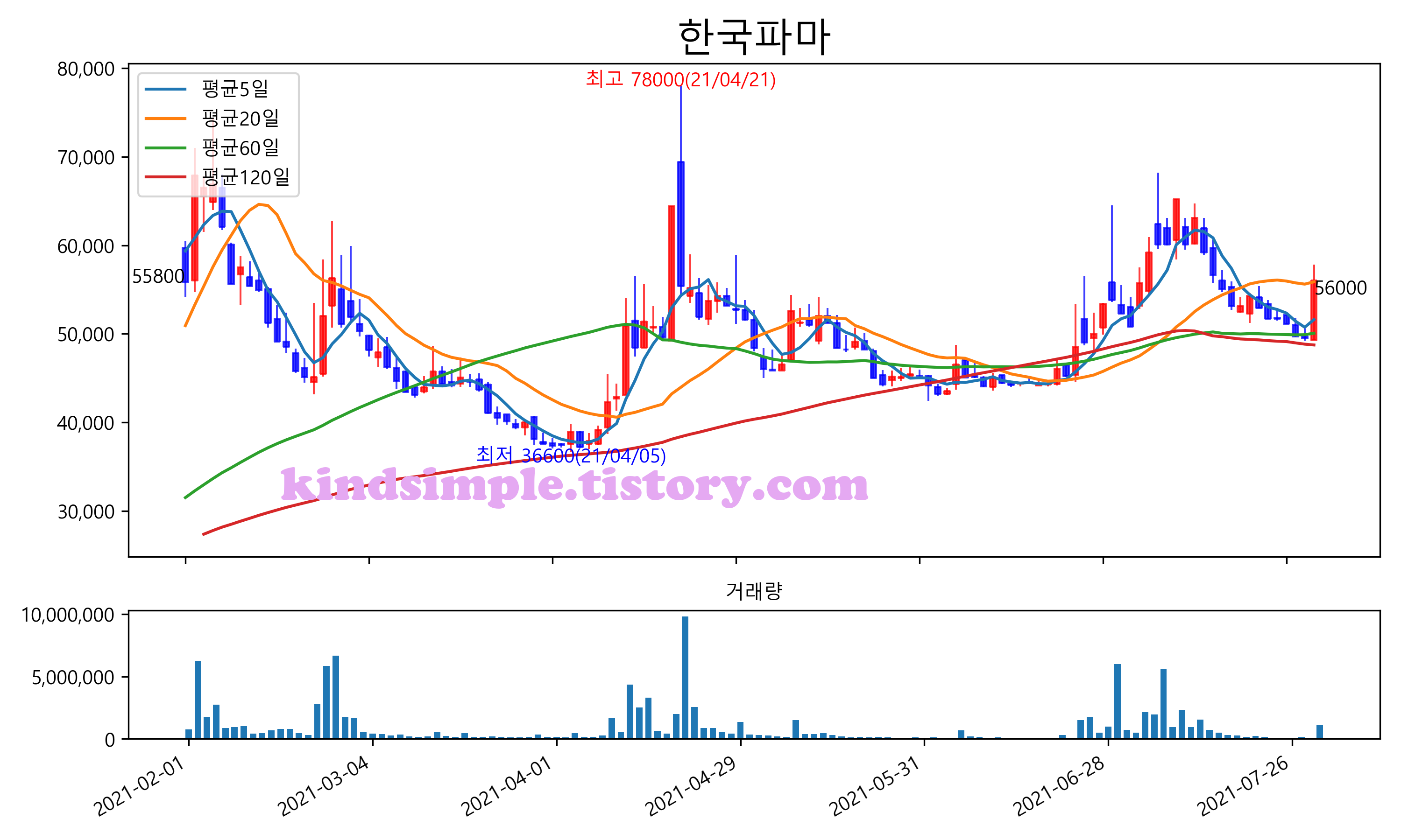 최근 6개월간 캔들차트 및 이동평균선입니다.