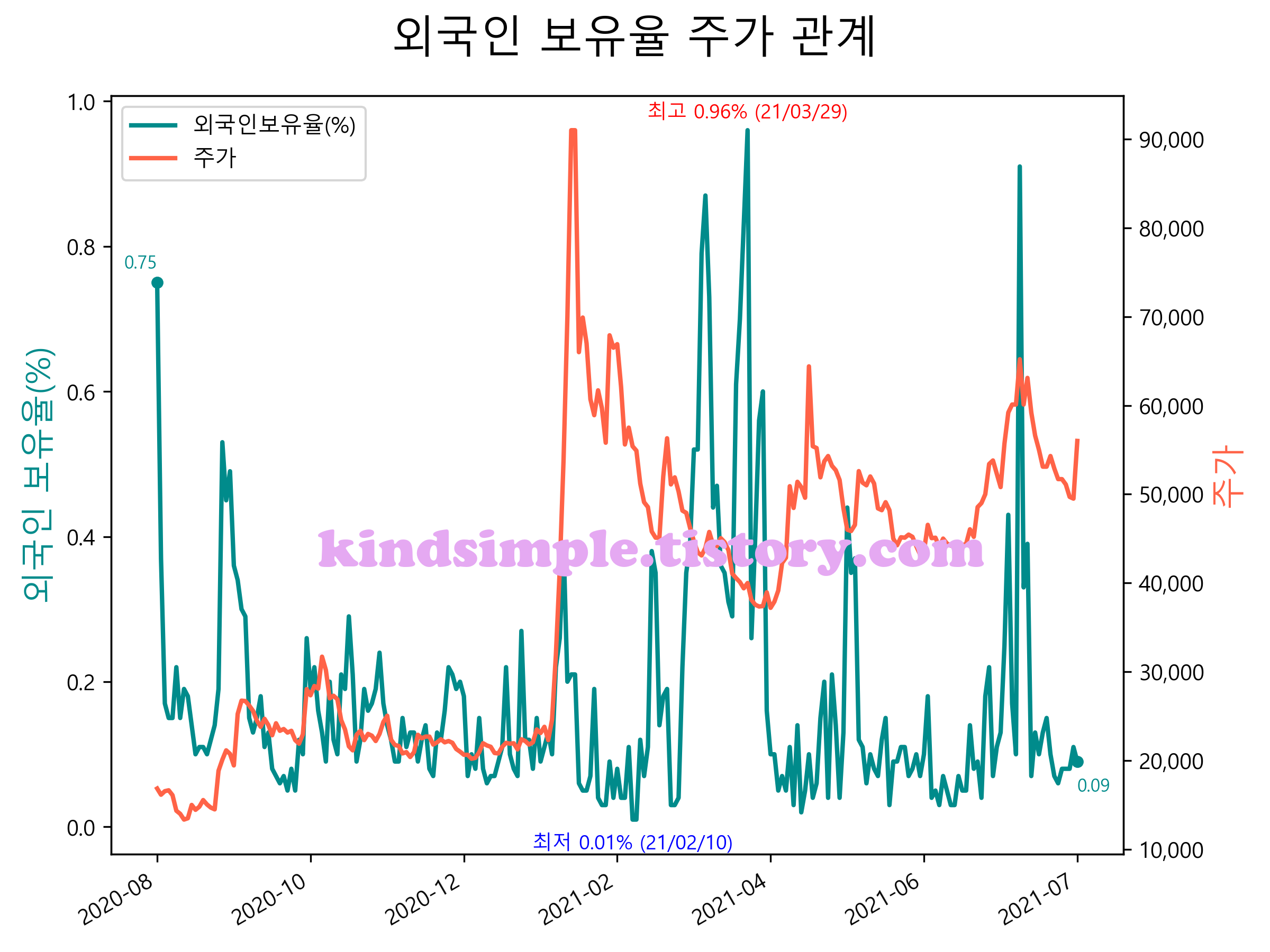 최근 1년간 외국인 보유율 및 주가와의 관계입니다.