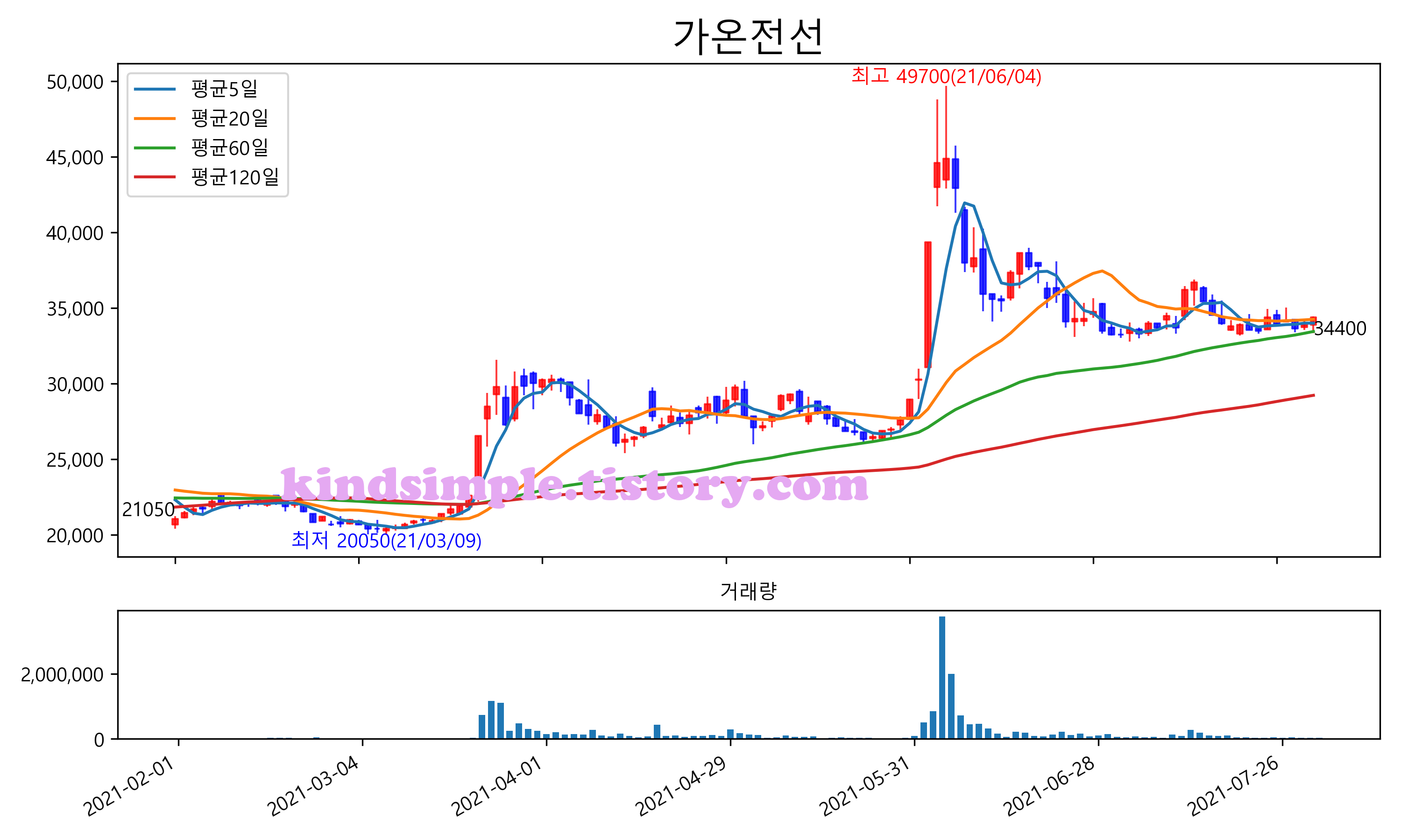 최근 6개월간 캔들차트 및 이동평균선입니다.