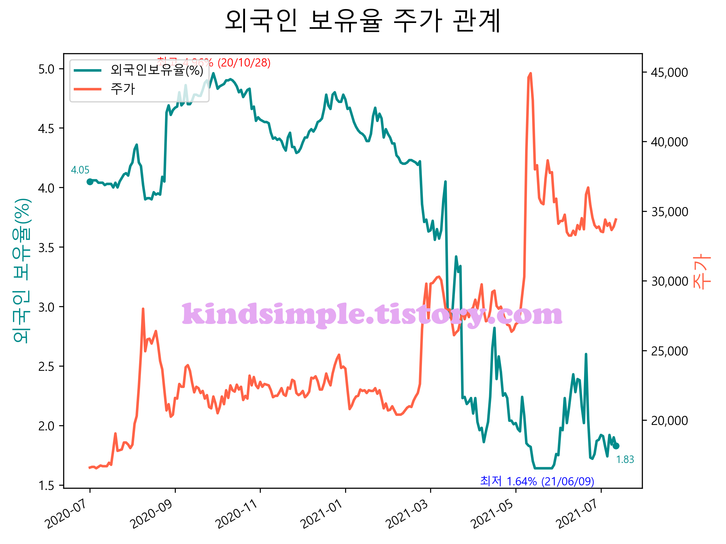 최근 1년간 외국인 보유율 및 주가와의 관계입니다.