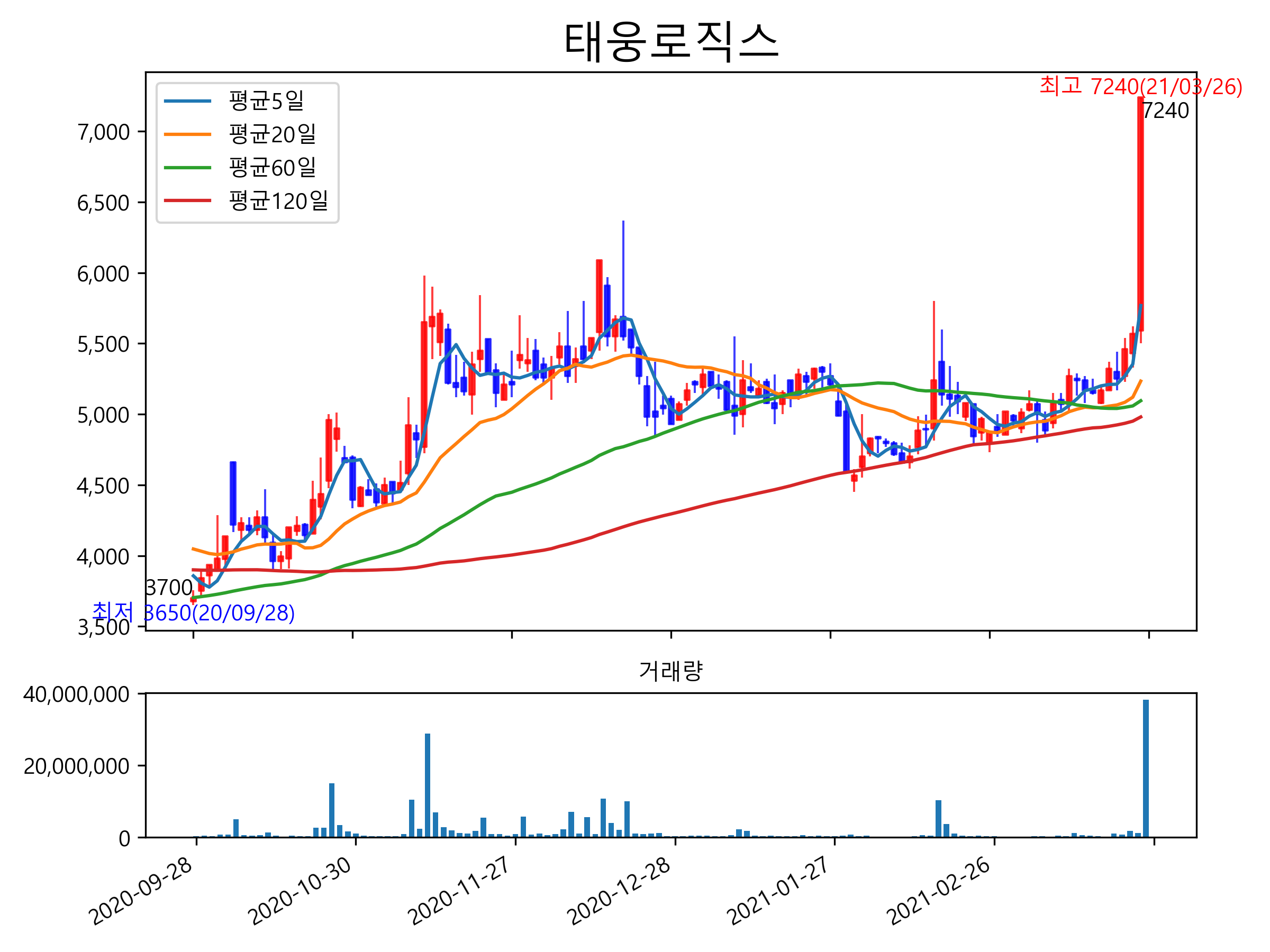 최근 6개월간 캔들차트 및 이동평균선입니다.