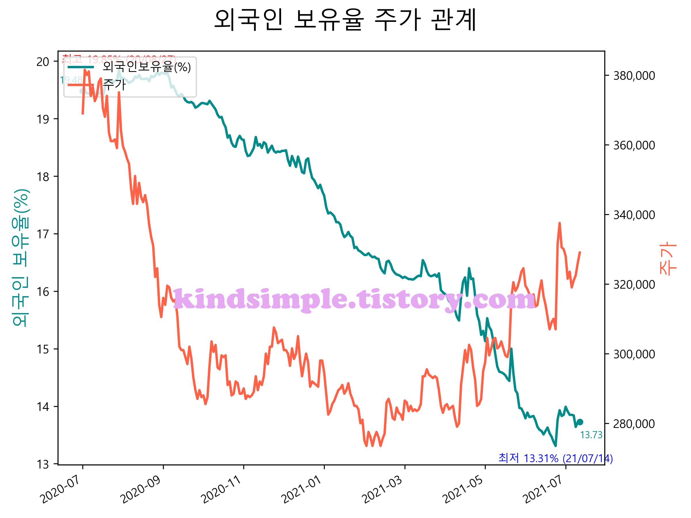 최근 1년간 외국인 보유율 및 주가와의 관계입니다.