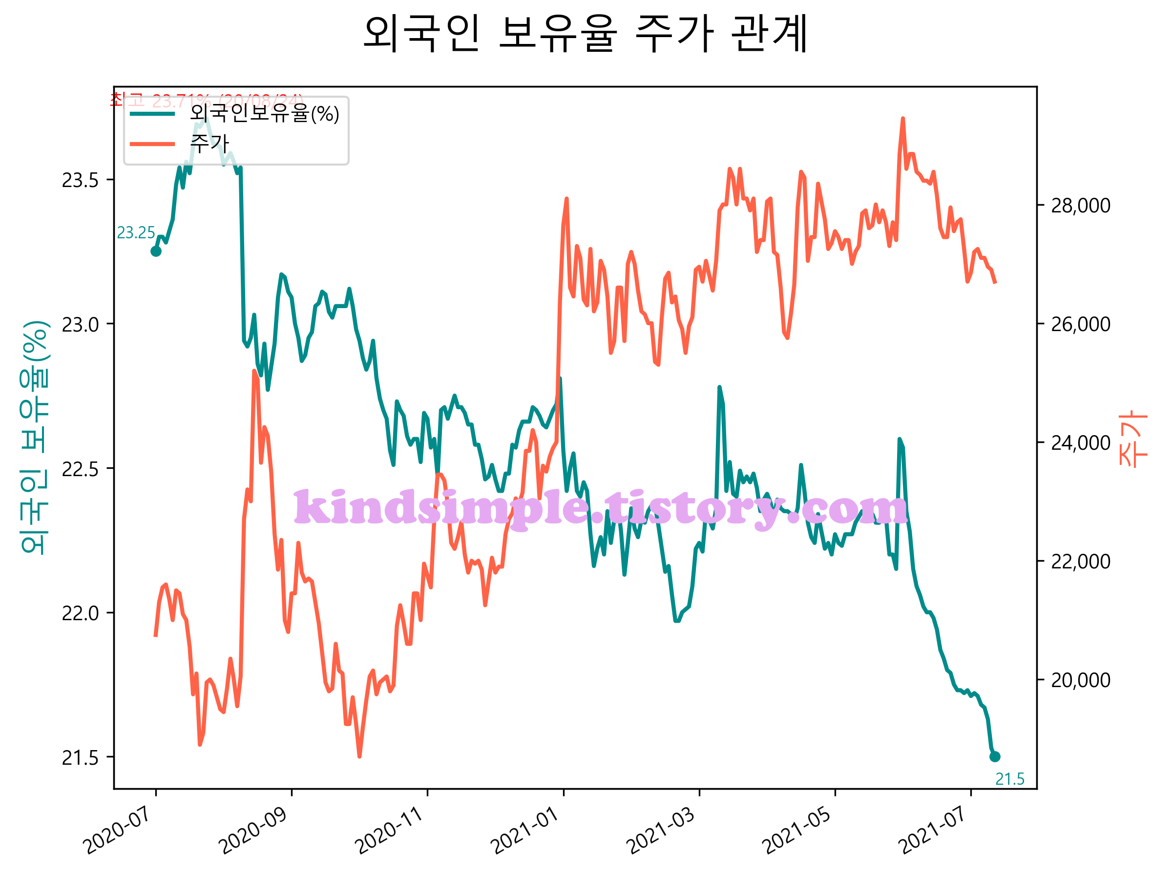 최근 1년간 외국인 보유율 및 주가와의 관계입니다.