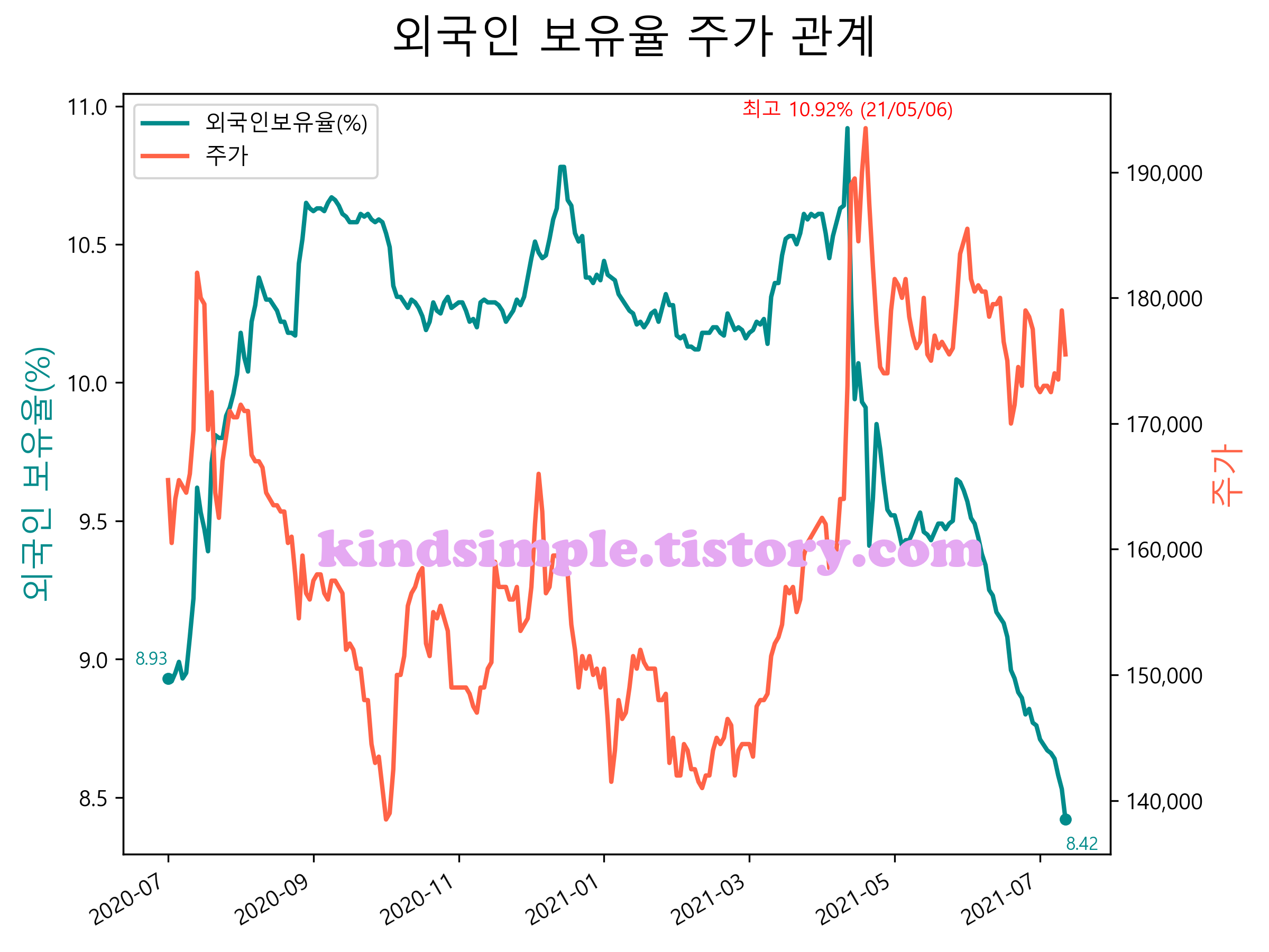 최근 1년간 외국인 보유율 및 주가와의 관계입니다.