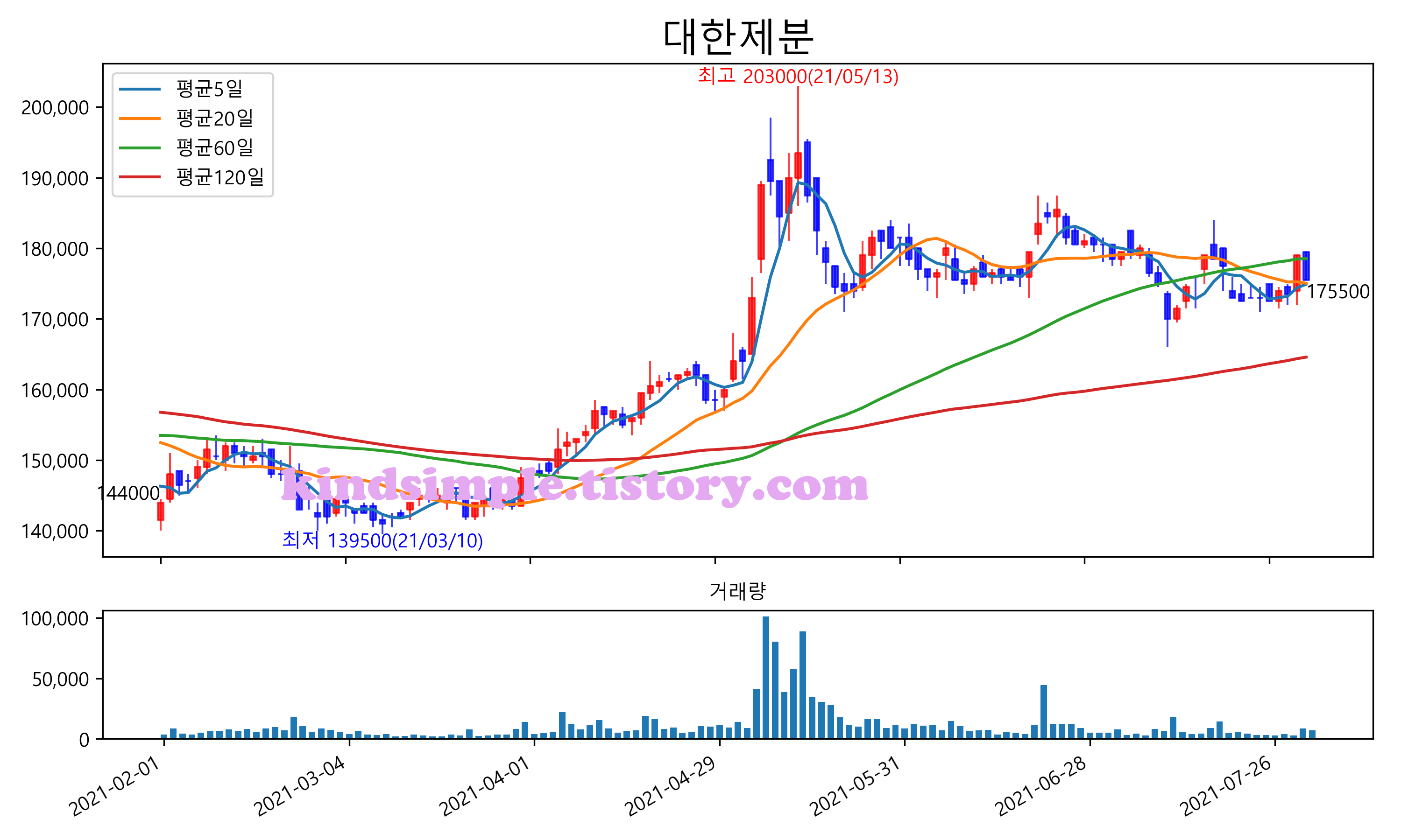 최근 6개월간 캔들차트 및 이동평균선입니다.