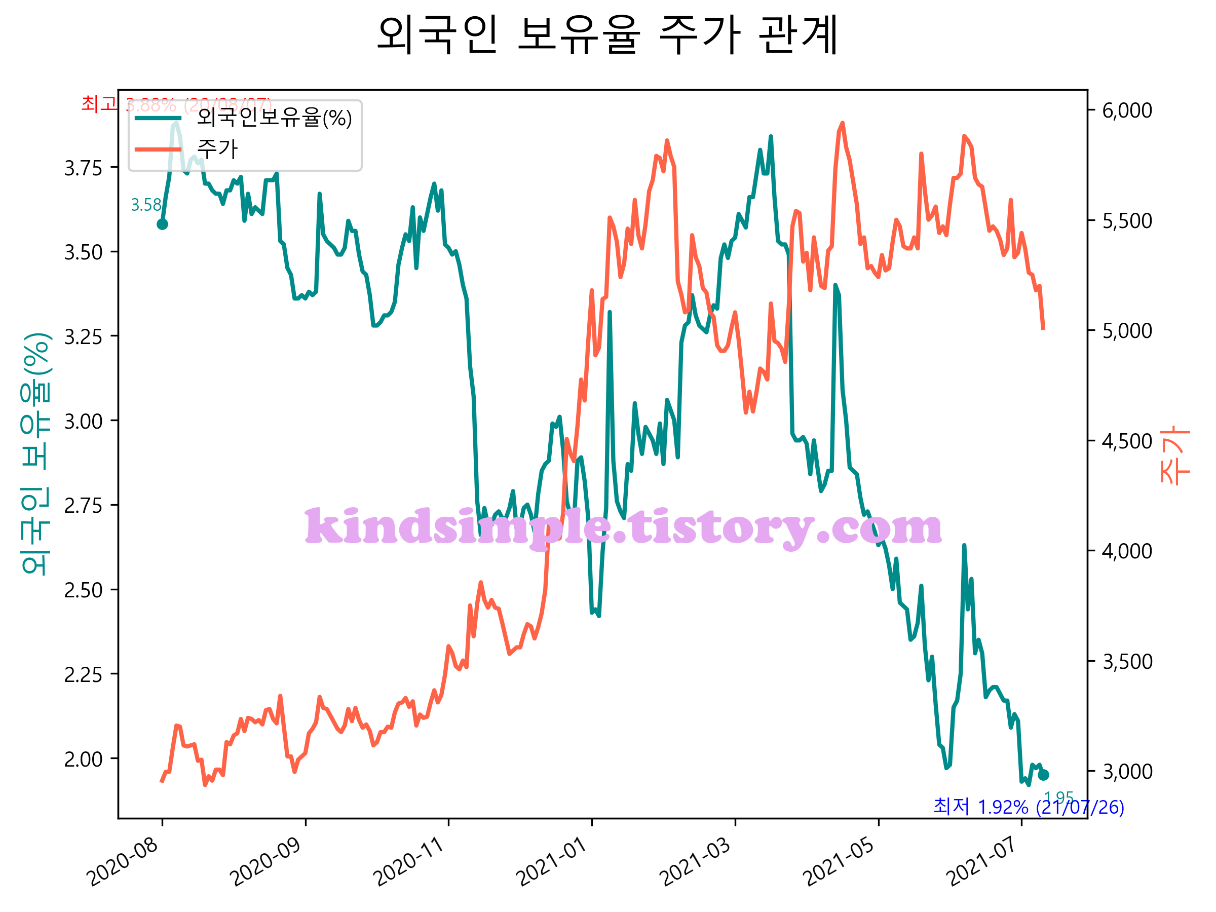 최근 1년간 외국인 보유율 및 주가와의 관계입니다.