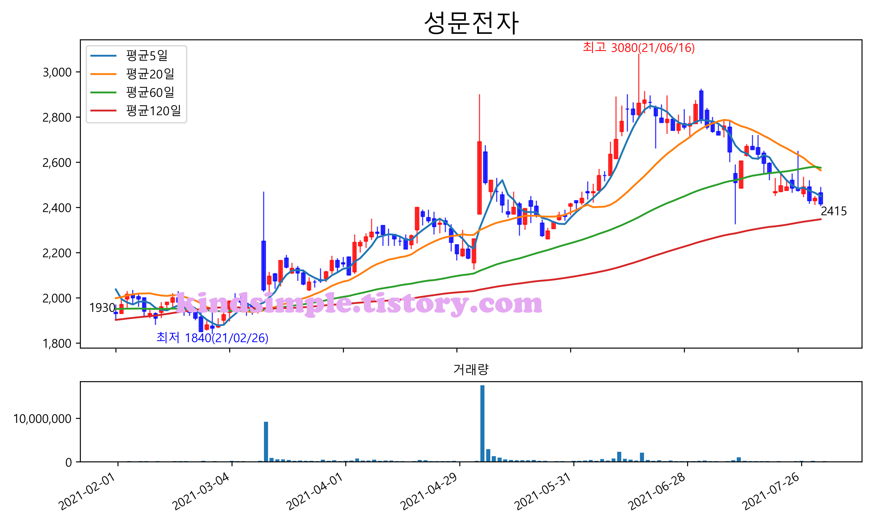 최근 6개월간 캔들차트 및 이동평균선입니다.
