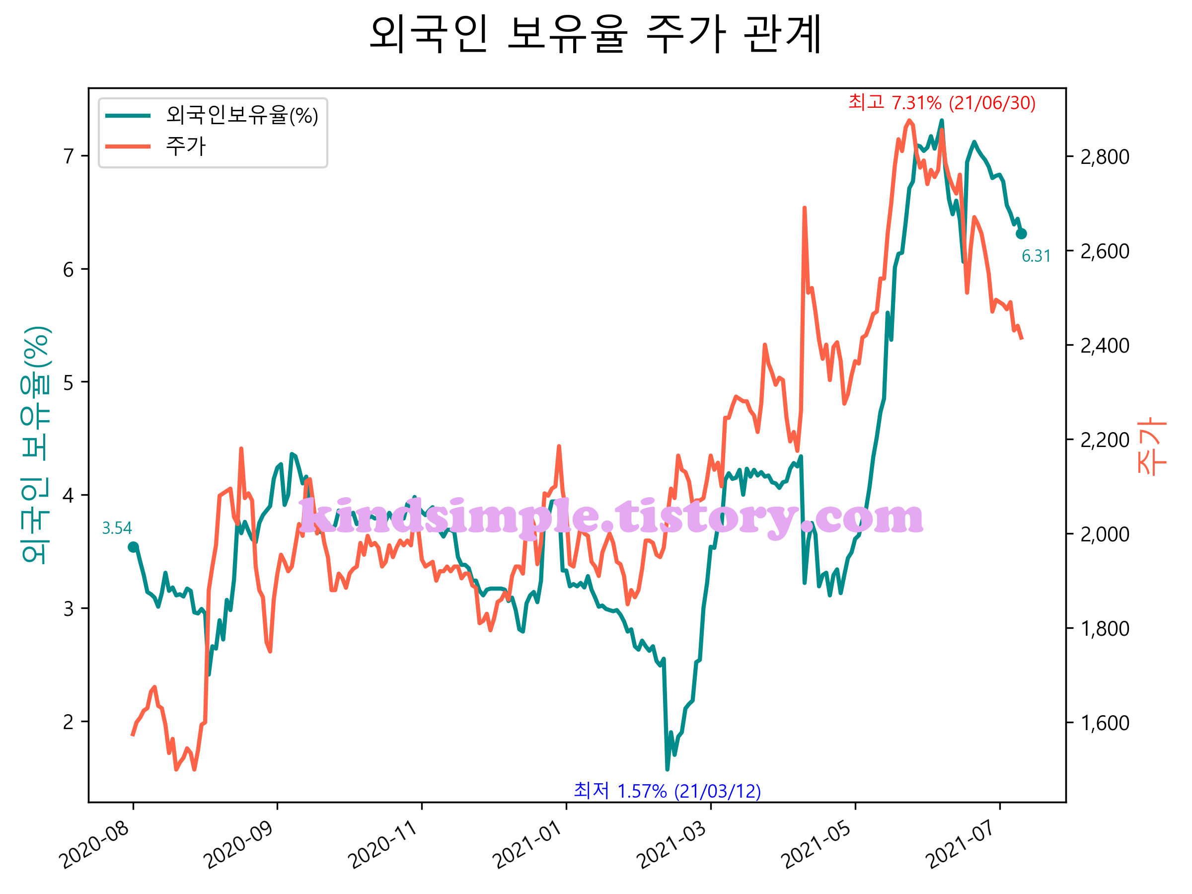 최근 1년간 외국인 보유율 및 주가와의 관계입니다.