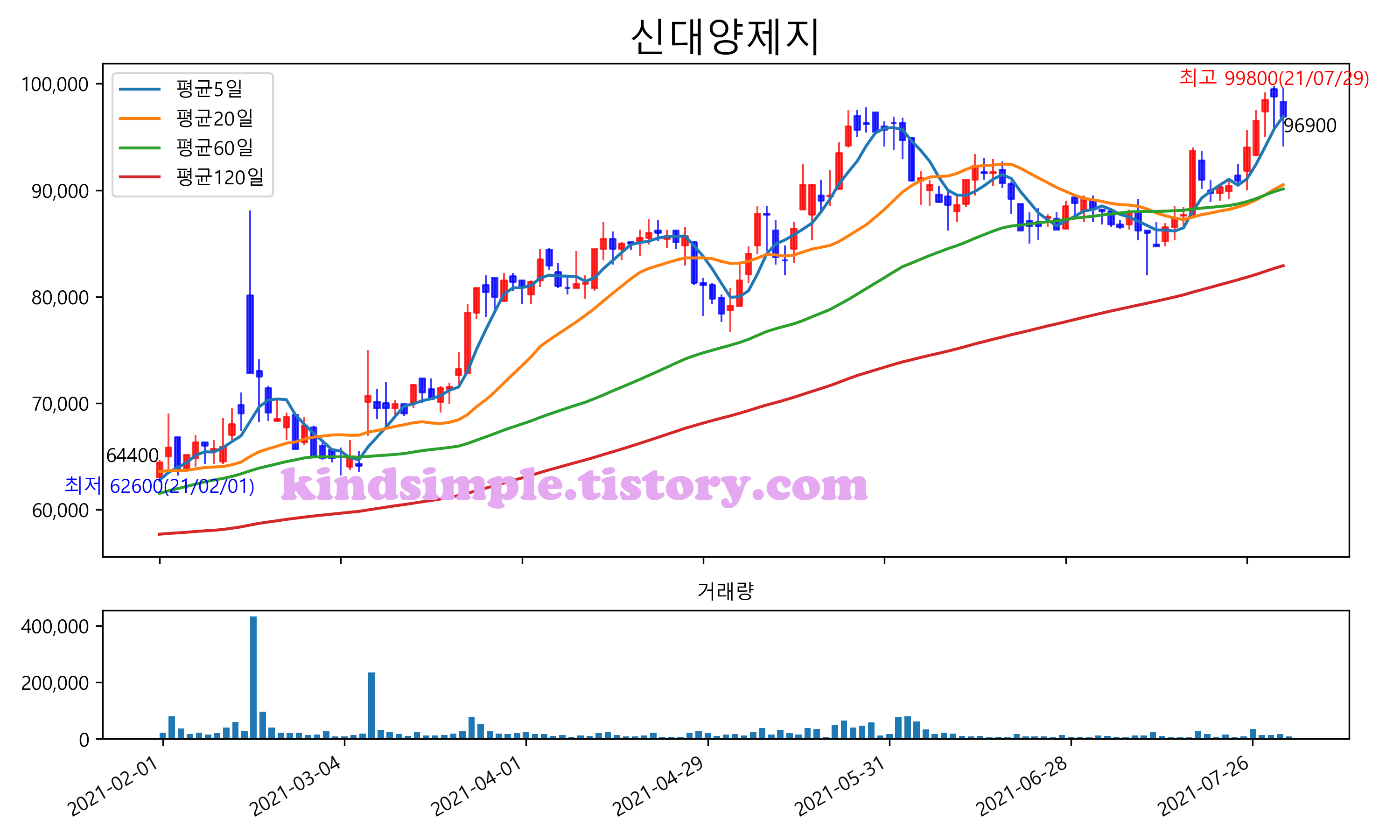최근 6개월간 캔들차트 및 이동평균선입니다.