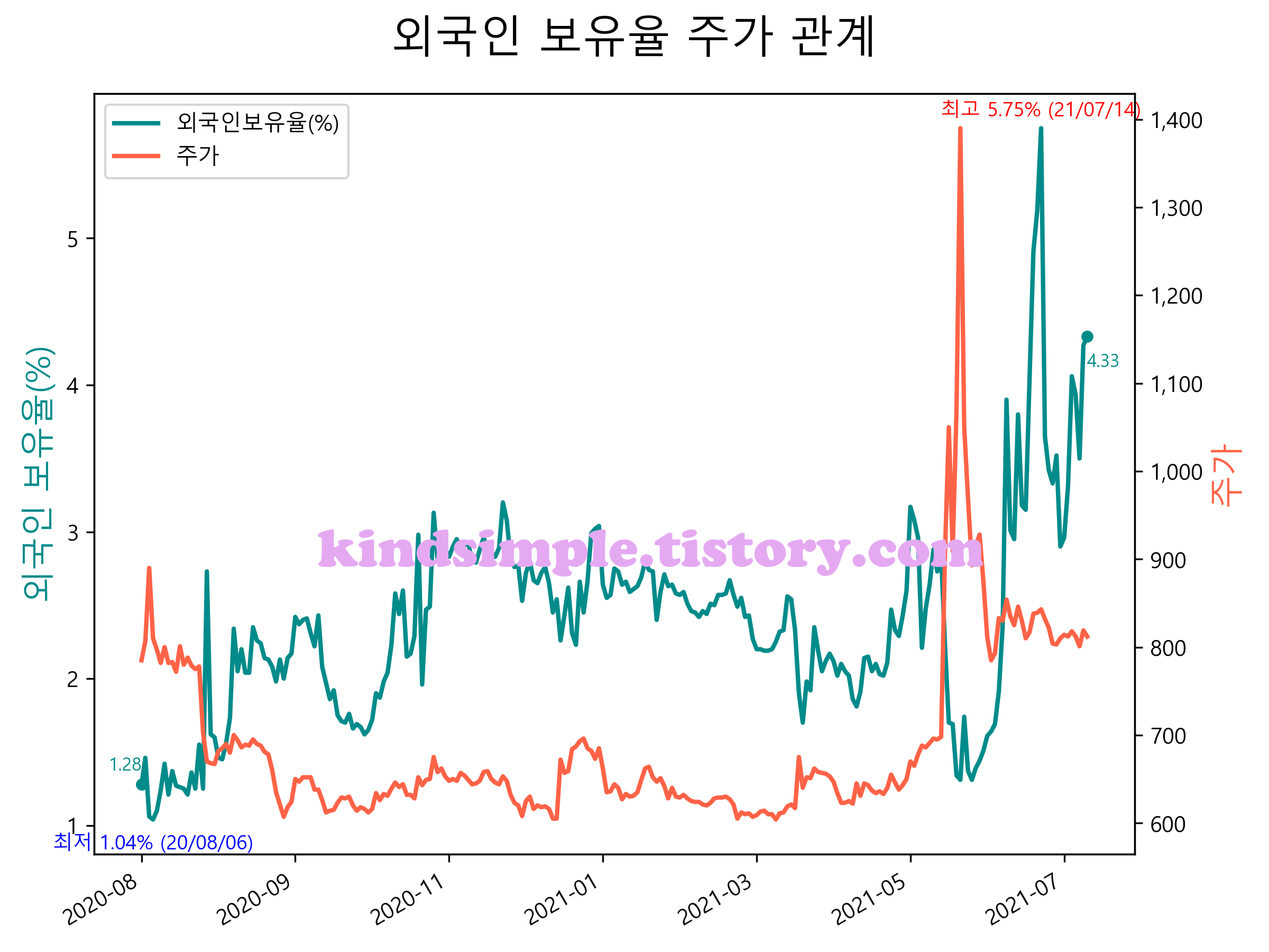 최근 1년간 외국인 보유율 및 주가와의 관계입니다.