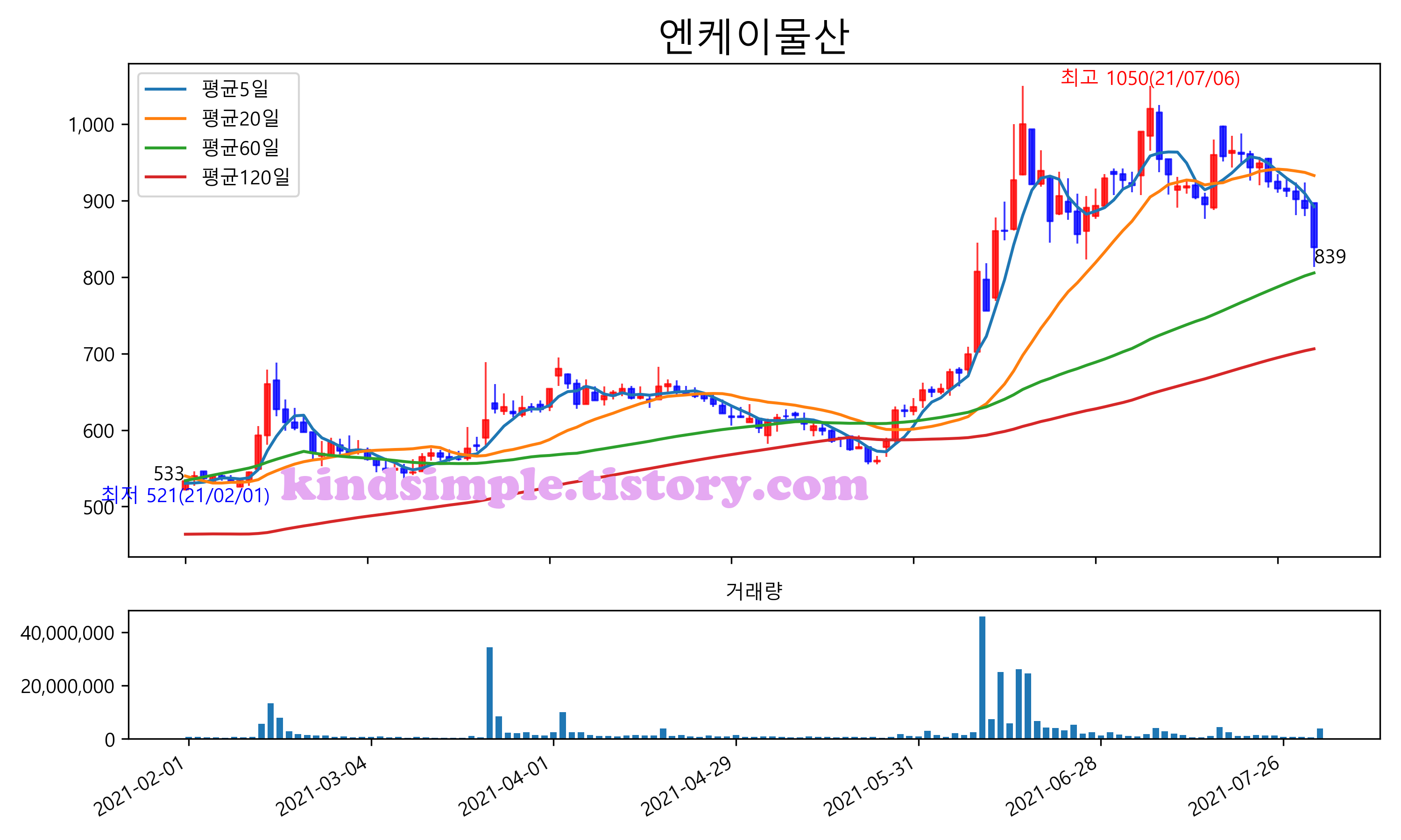 최근 6개월간 캔들차트 및 이동평균선입니다.