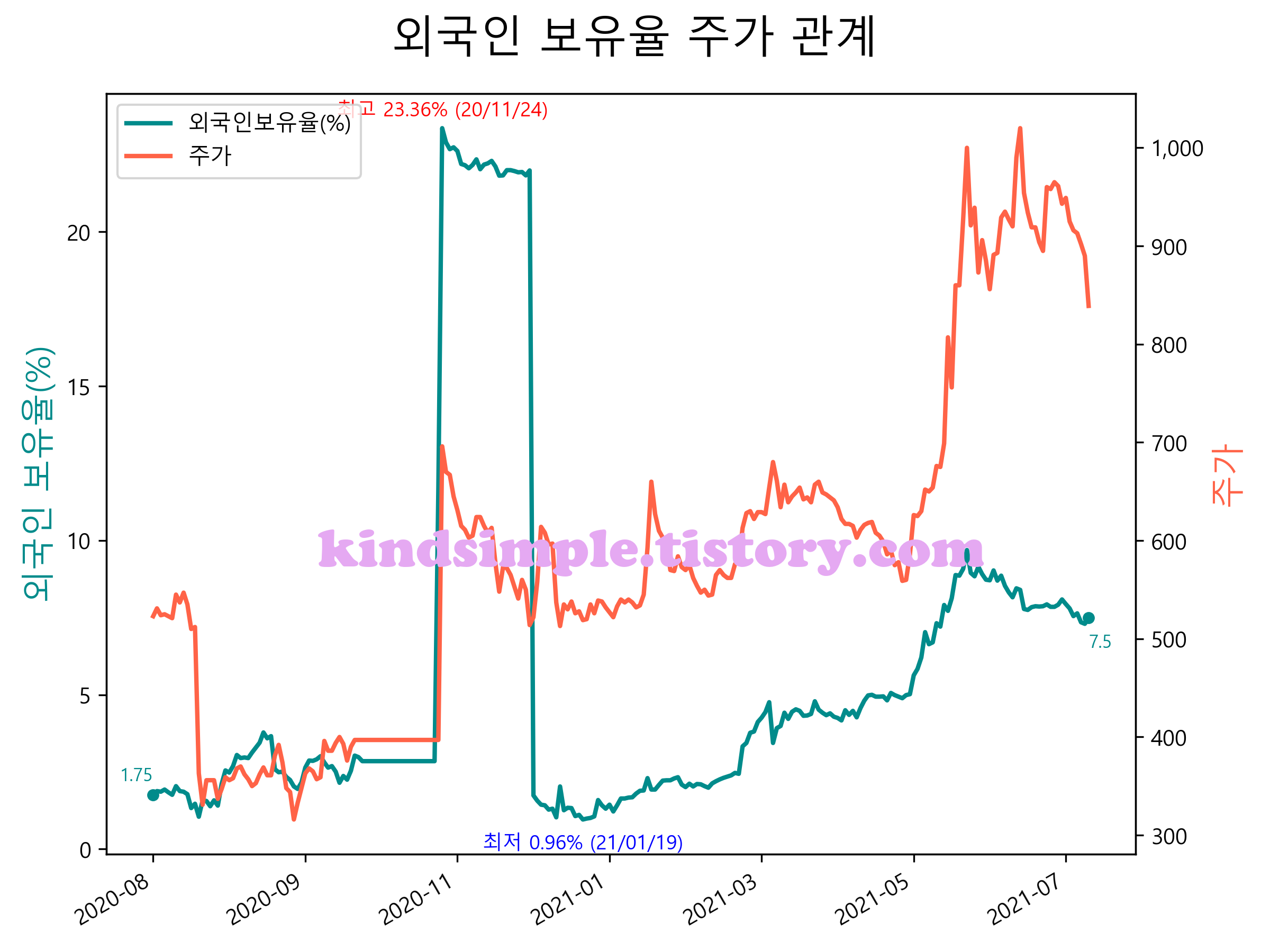 최근 1년간 외국인 보유율 및 주가와의 관계입니다.
