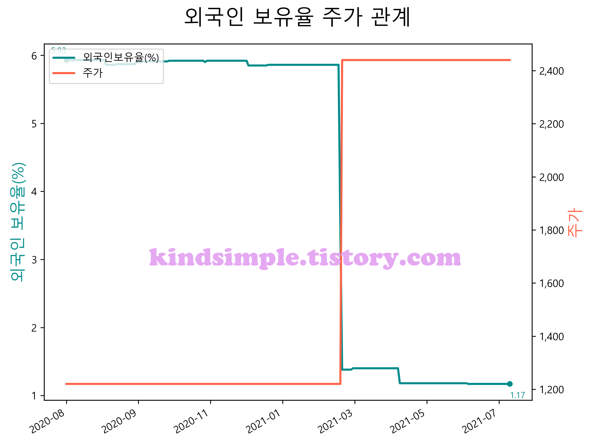 최근 1년간 외국인 보유율 및 주가와의 관계입니다.