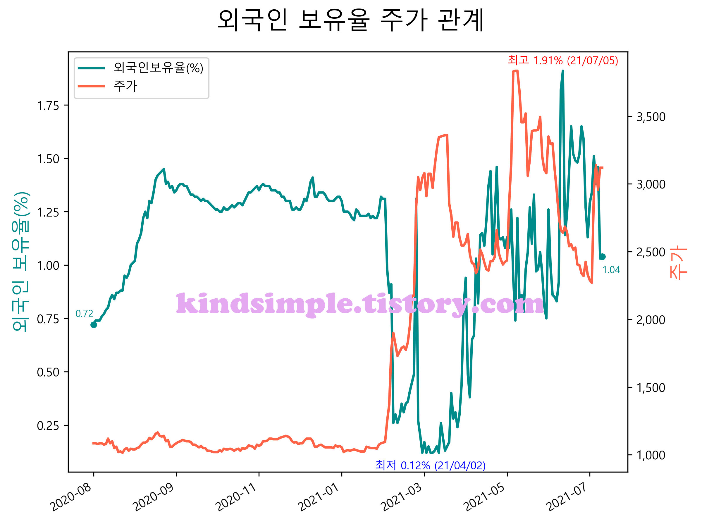 최근 1년간 외국인 보유율 및 주가와의 관계입니다.
