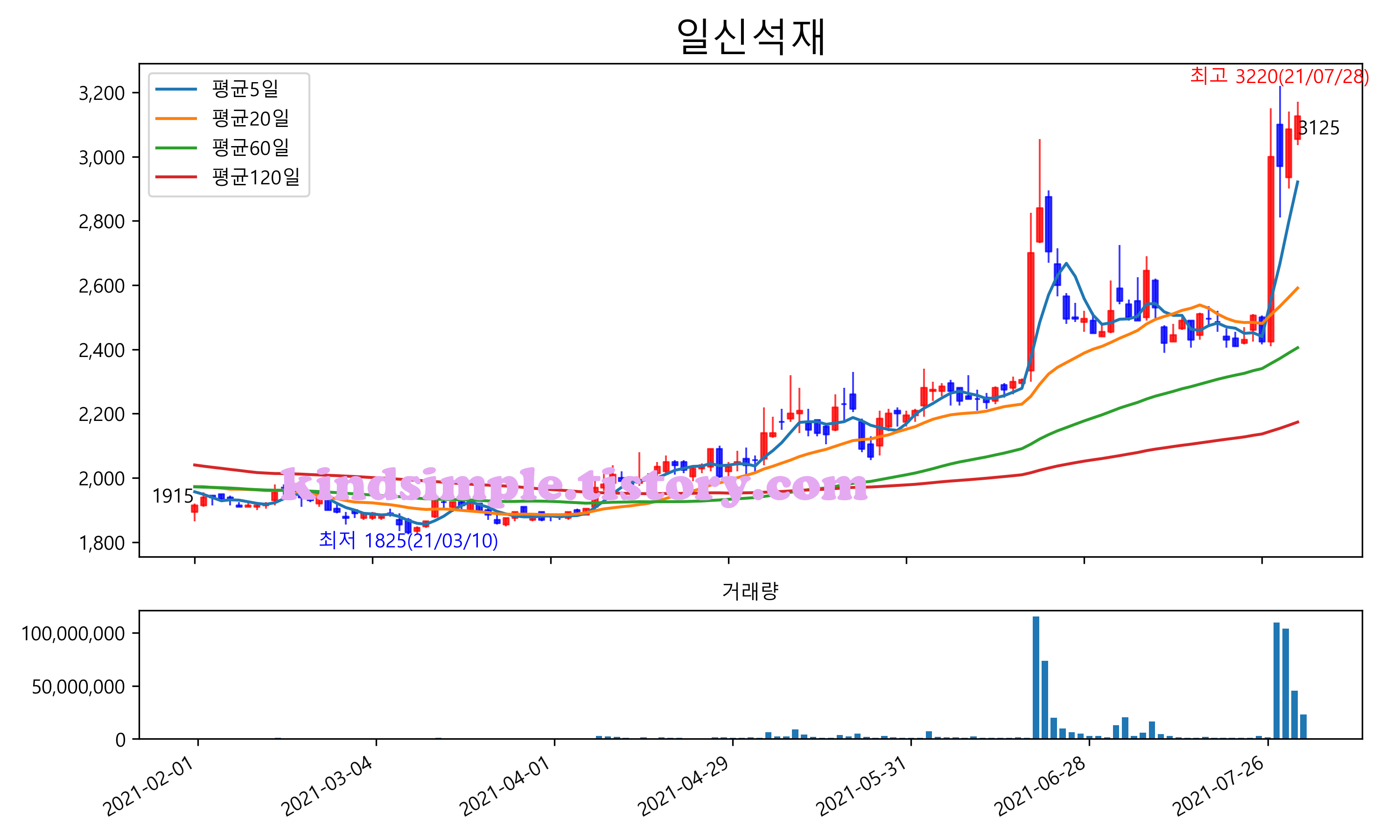 최근 6개월간 캔들차트 및 이동평균선입니다.