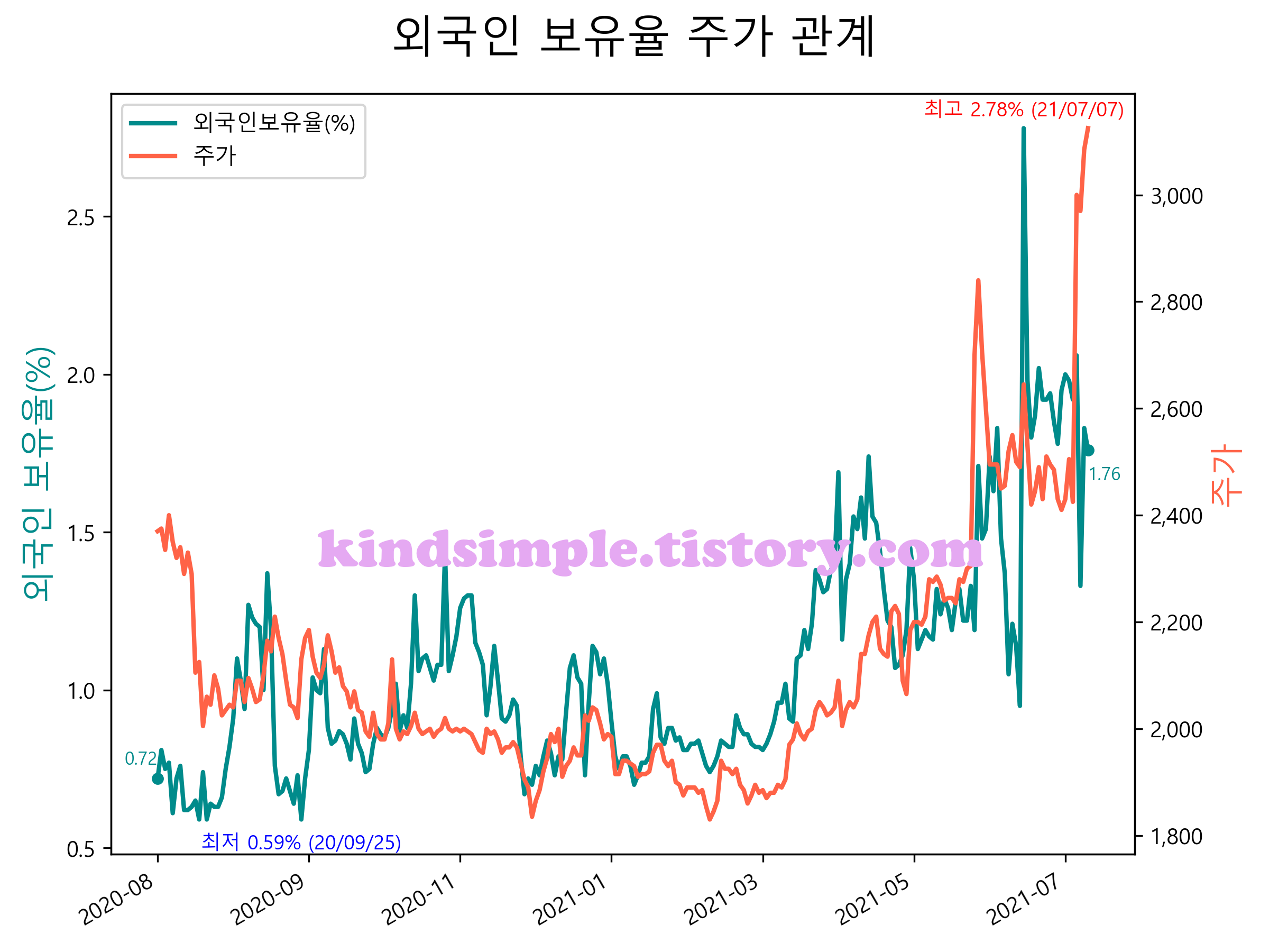 최근 1년간 외국인 보유율 및 주가와의 관계입니다.