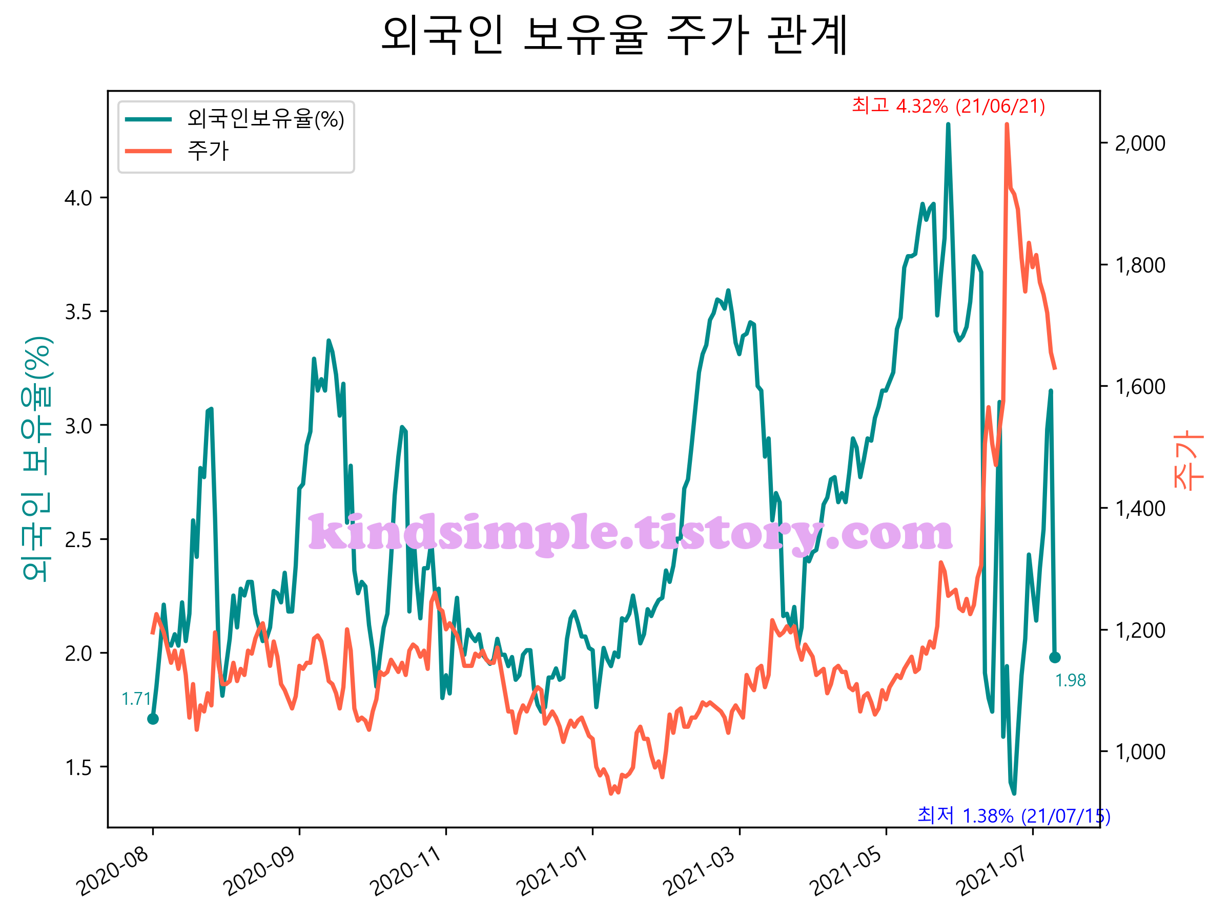 최근 1년간 외국인 보유율 및 주가와의 관계입니다.