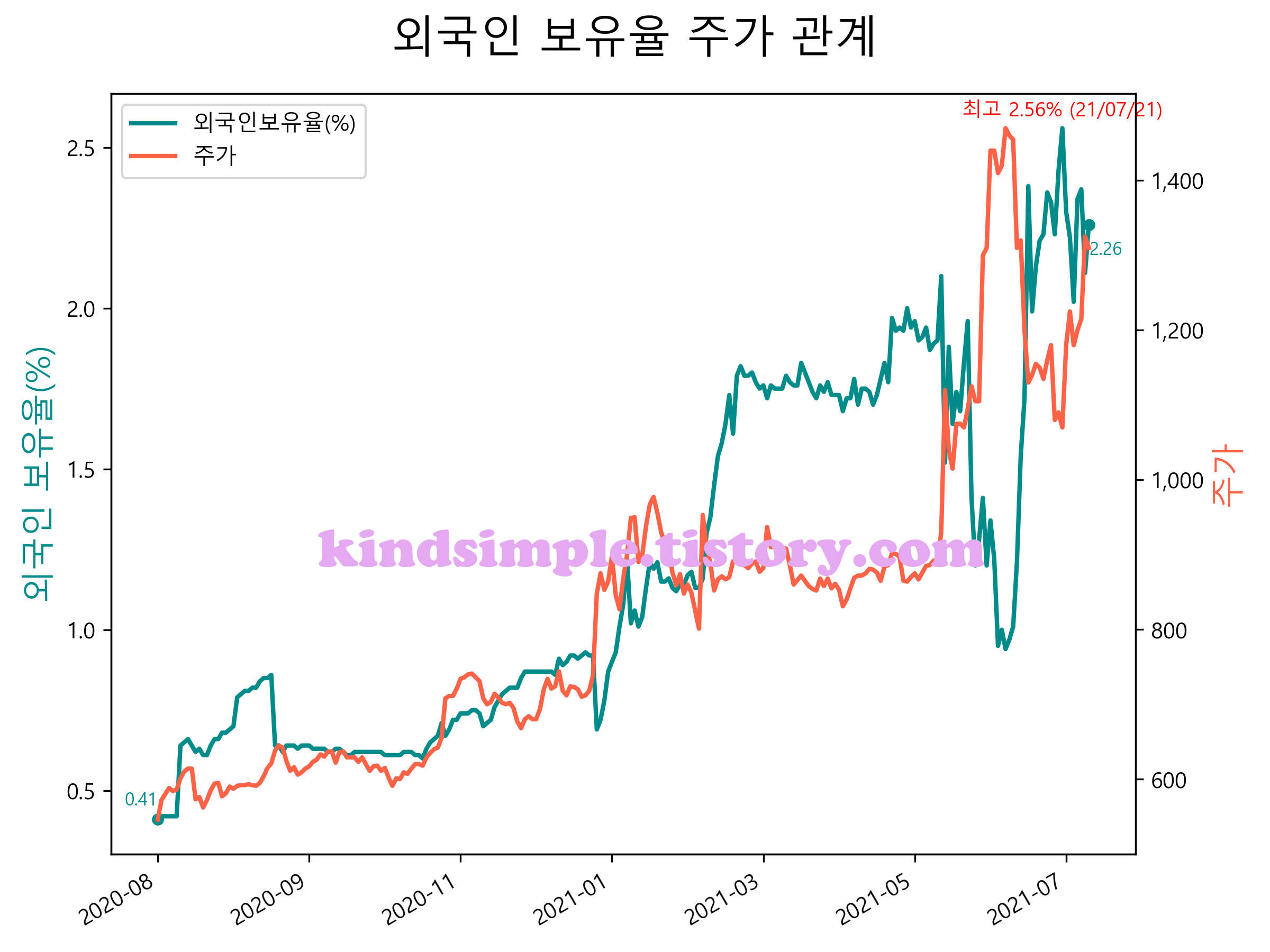 최근 1년간 외국인 보유율 및 주가와의 관계입니다.