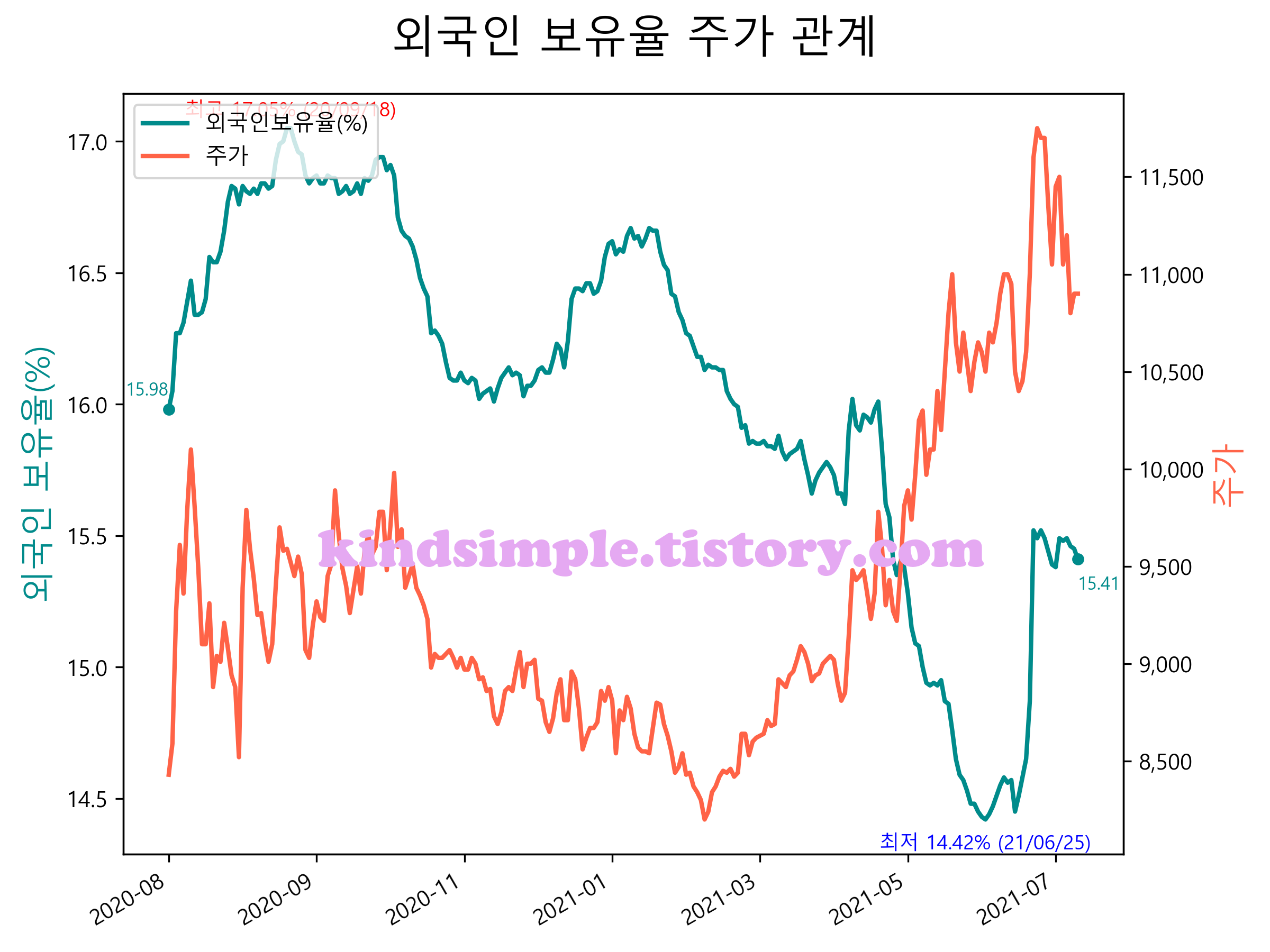 최근 1년간 외국인 보유율 및 주가와의 관계입니다.