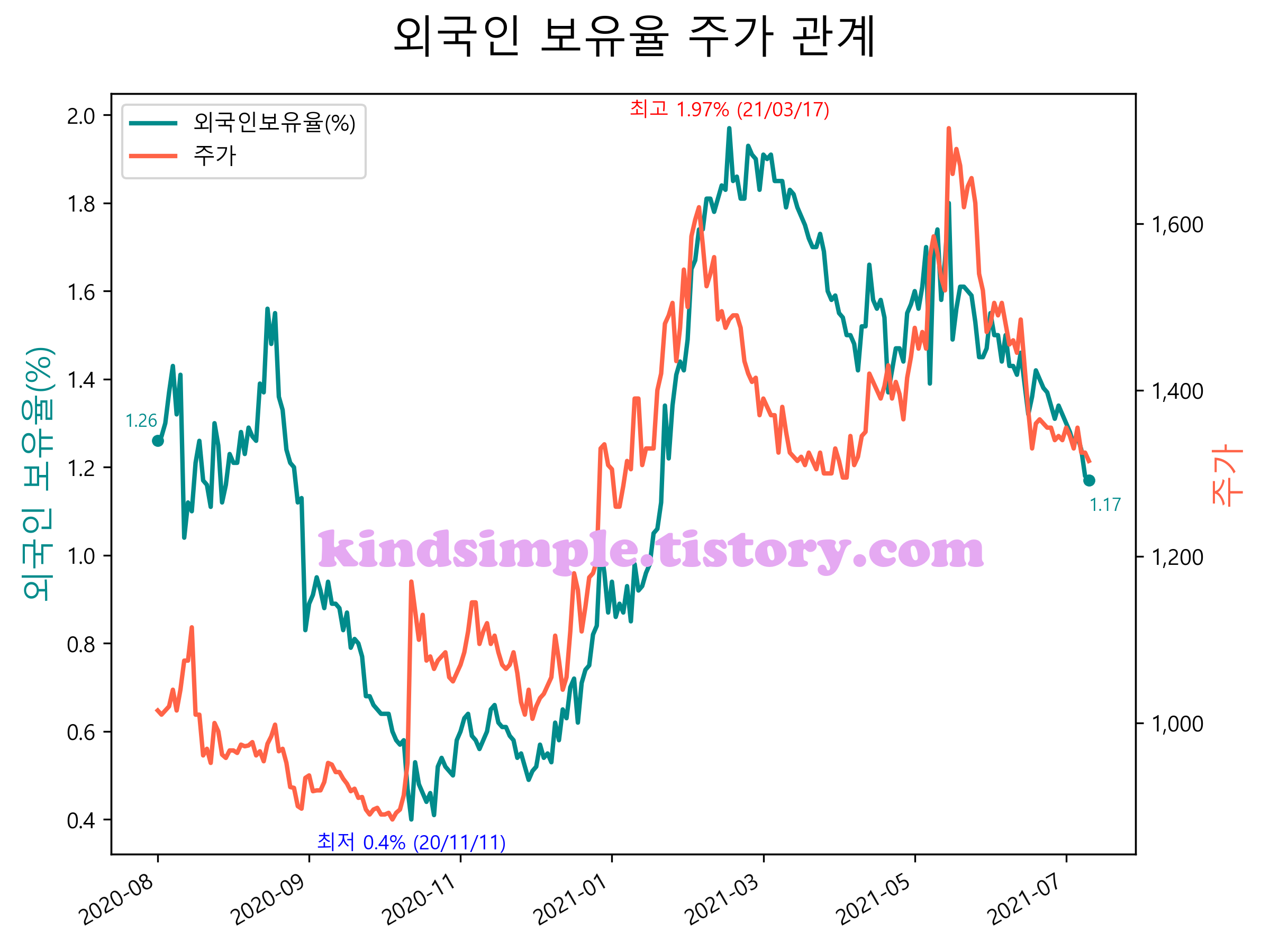 최근 1년간 외국인 보유율 및 주가와의 관계입니다.