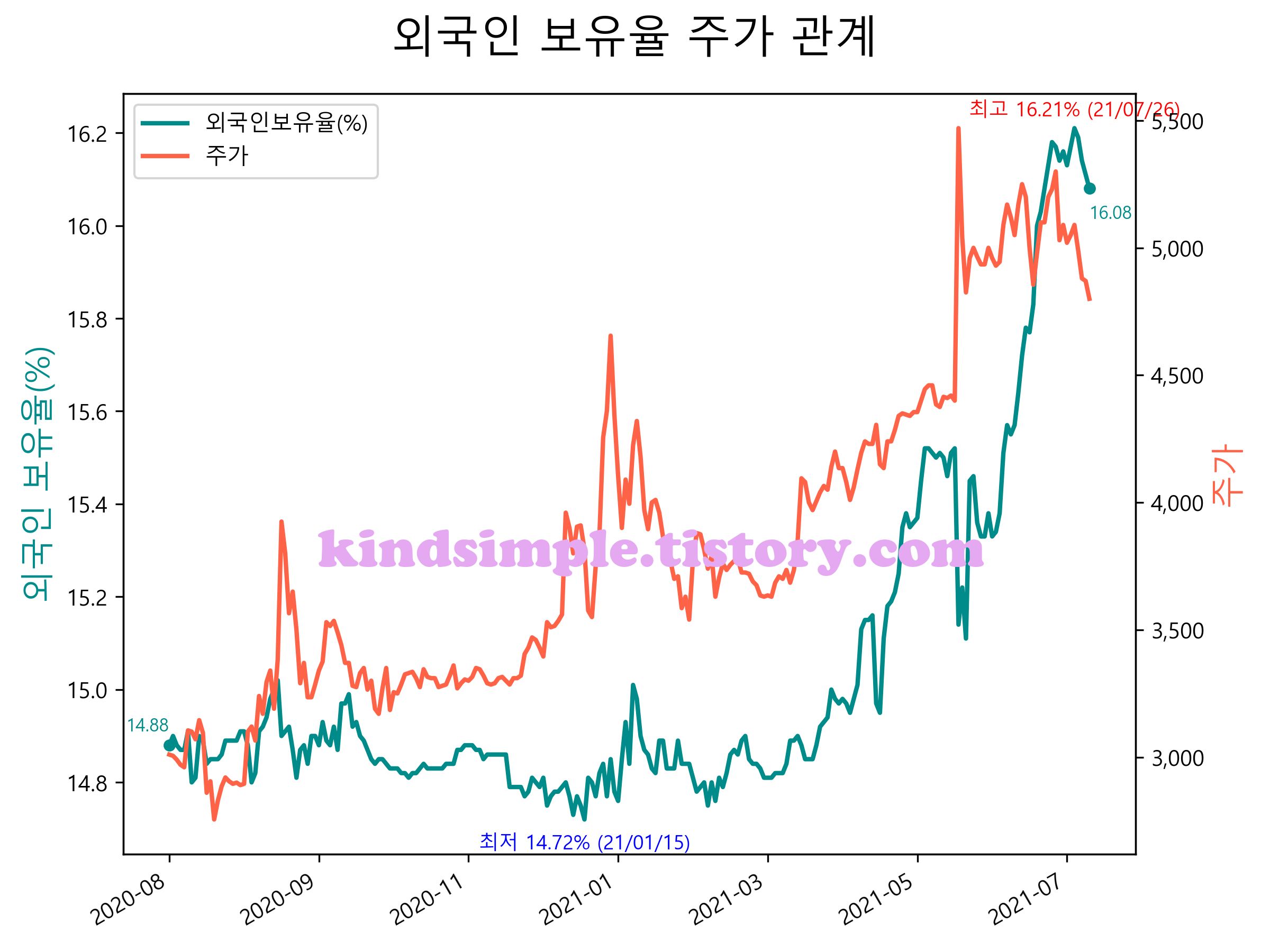 최근 1년간 외국인 보유율 및 주가와의 관계입니다.