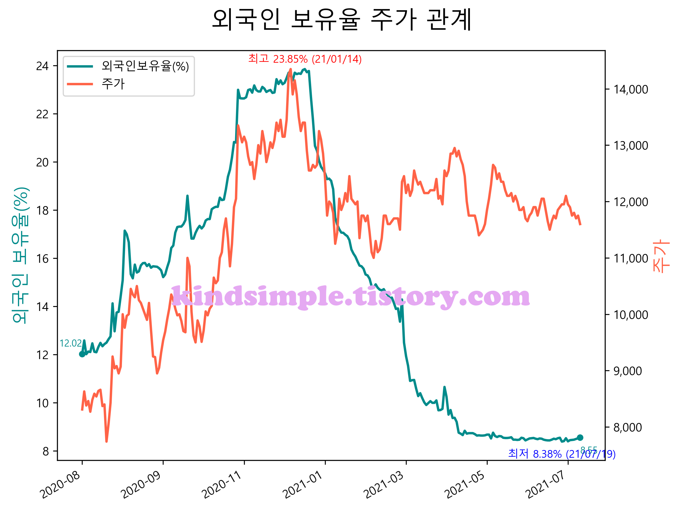 최근 1년간 외국인 보유율 및 주가와의 관계입니다.
