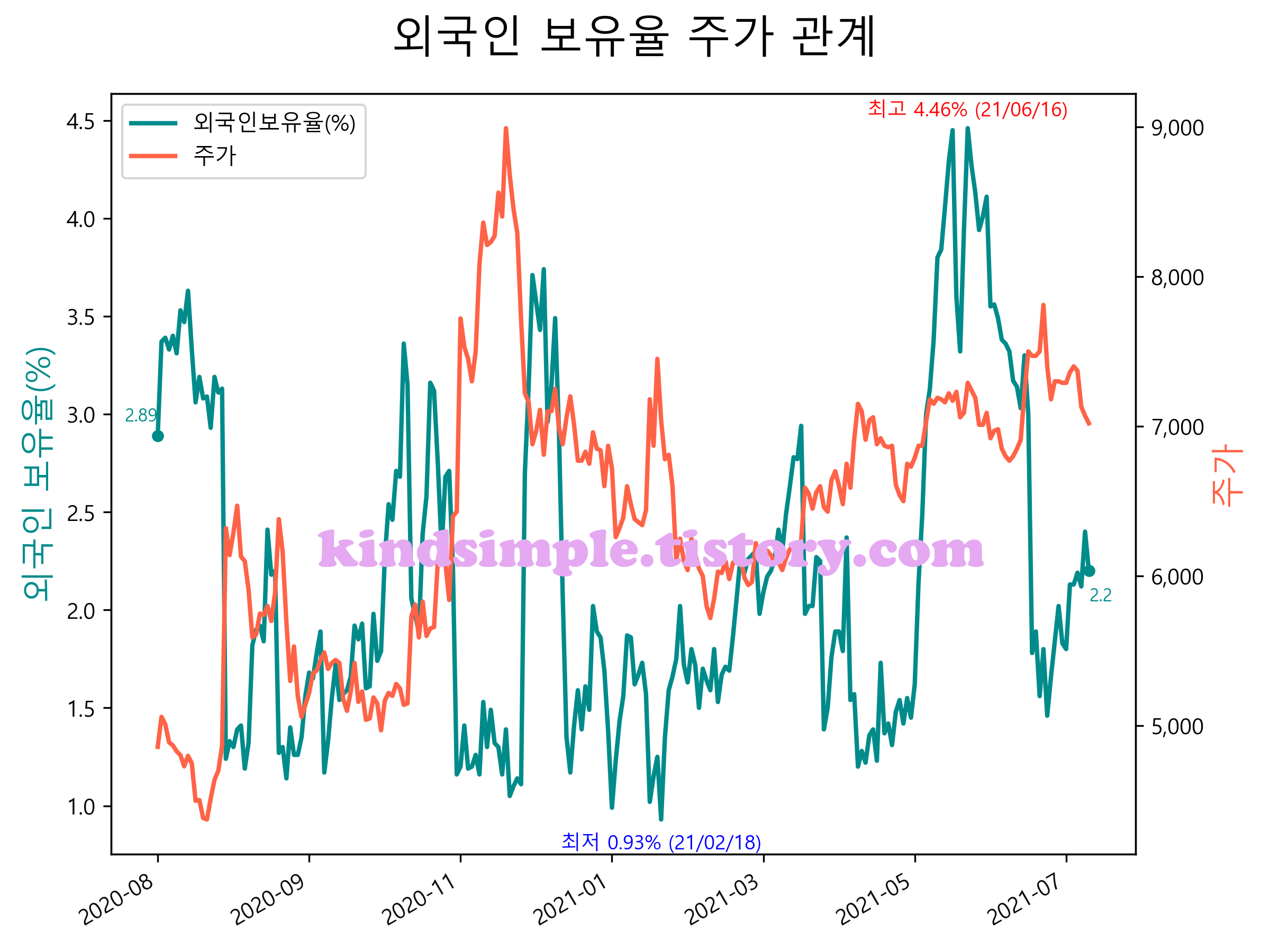 최근 1년간 외국인 보유율 및 주가와의 관계입니다.
