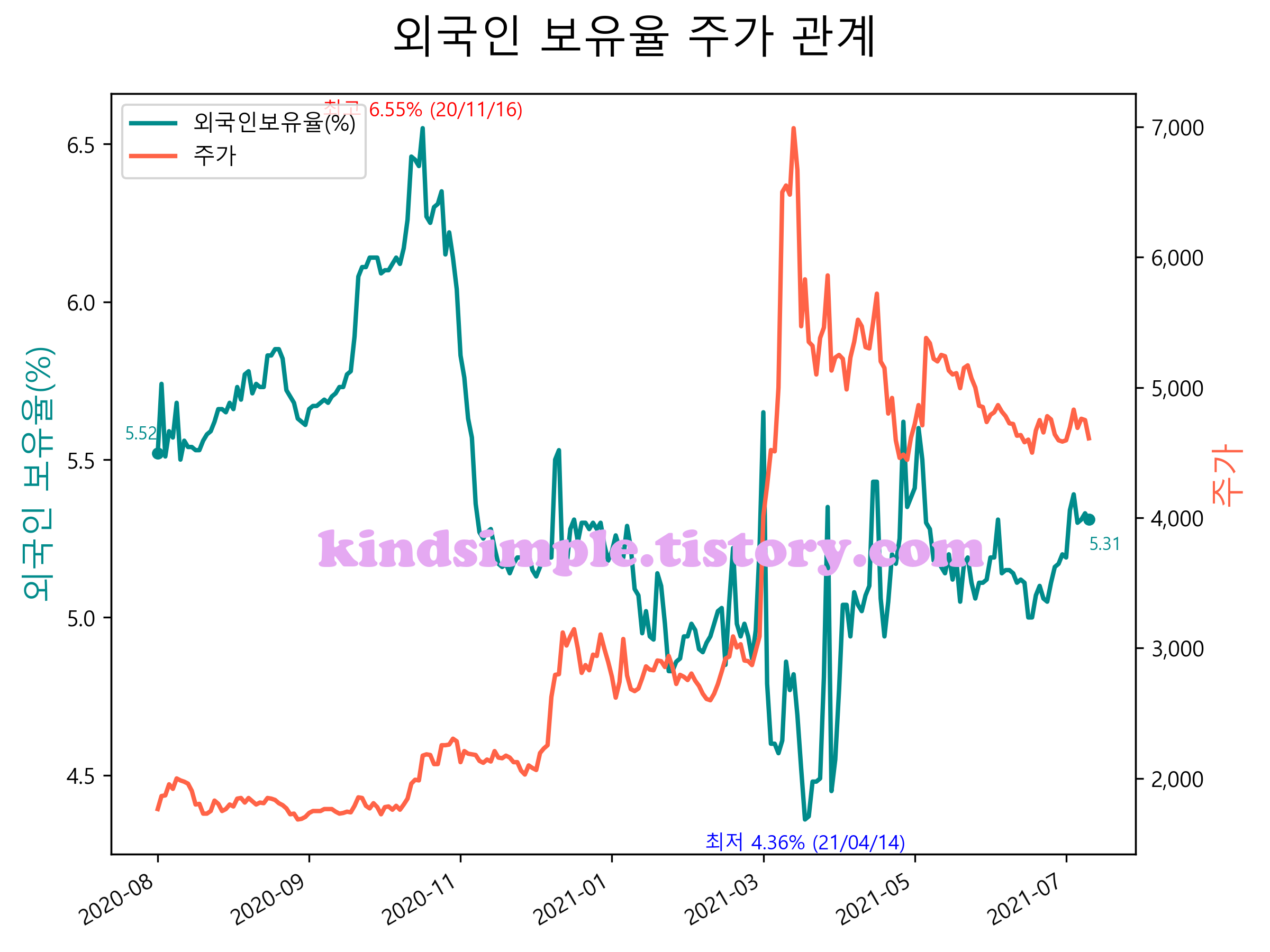 최근 1년간 외국인 보유율 및 주가와의 관계입니다.