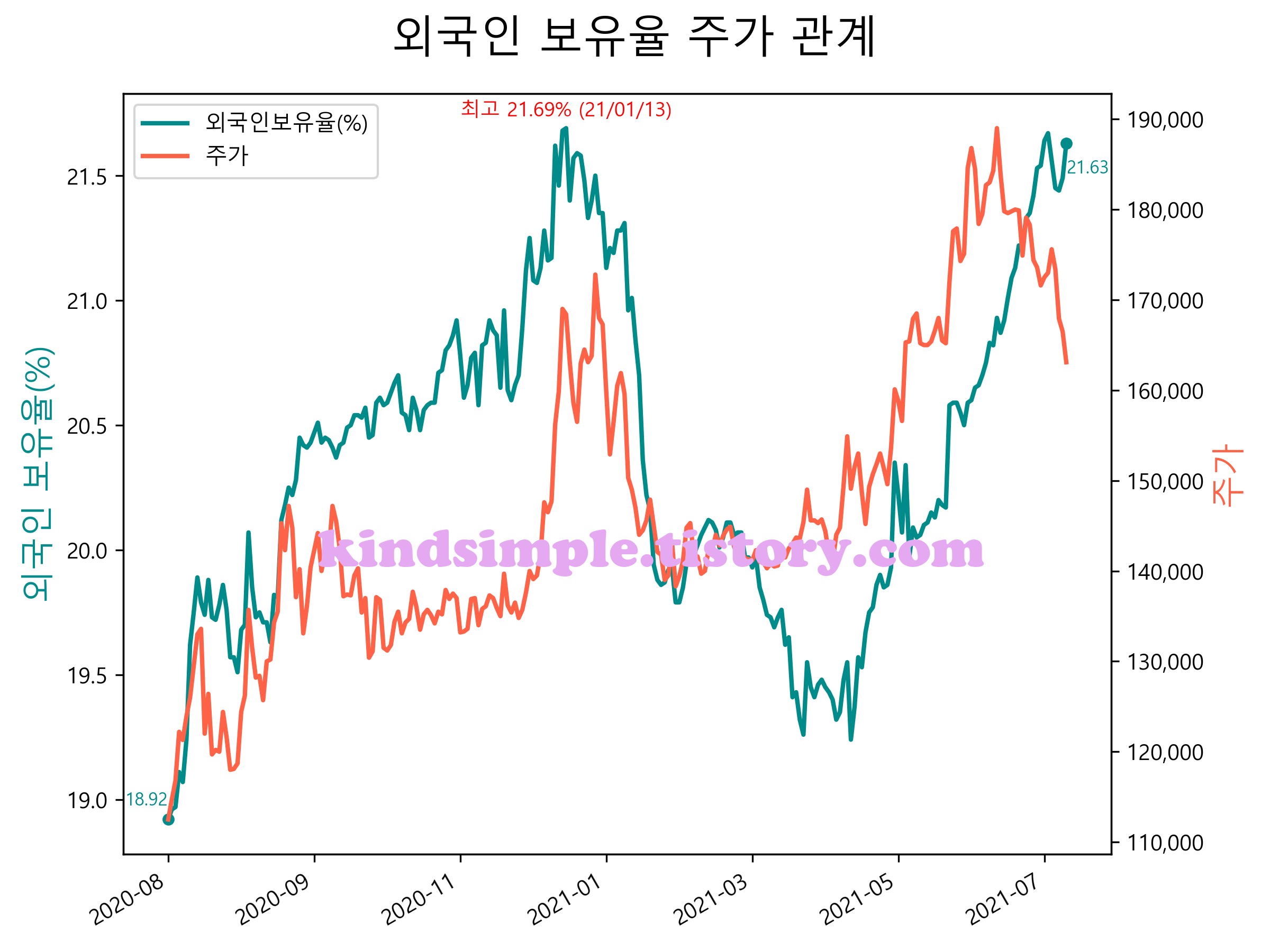 최근 1년간 외국인 보유율 및 주가와의 관계입니다.
