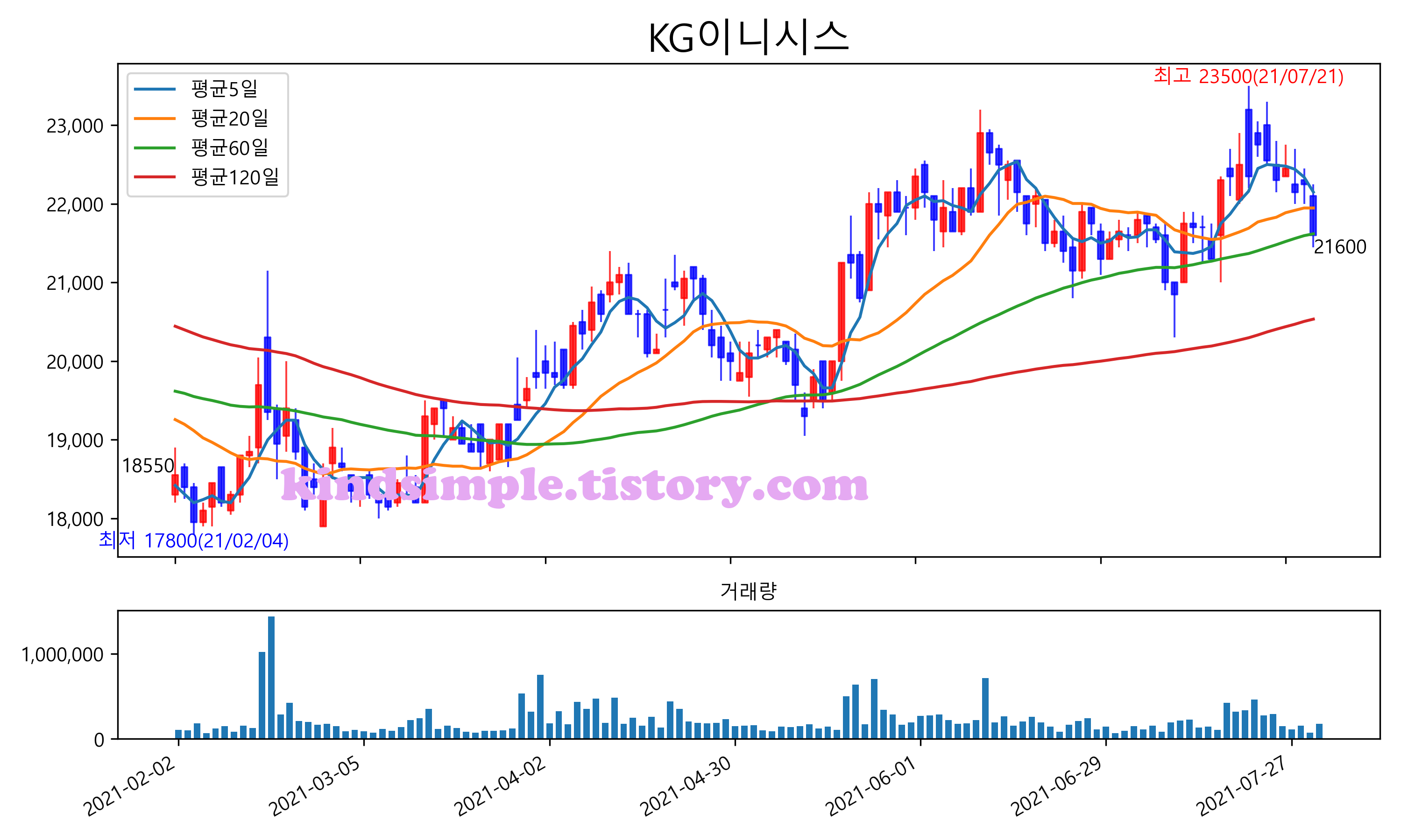 최근 6개월간 캔들차트 및 이동평균선입니다.