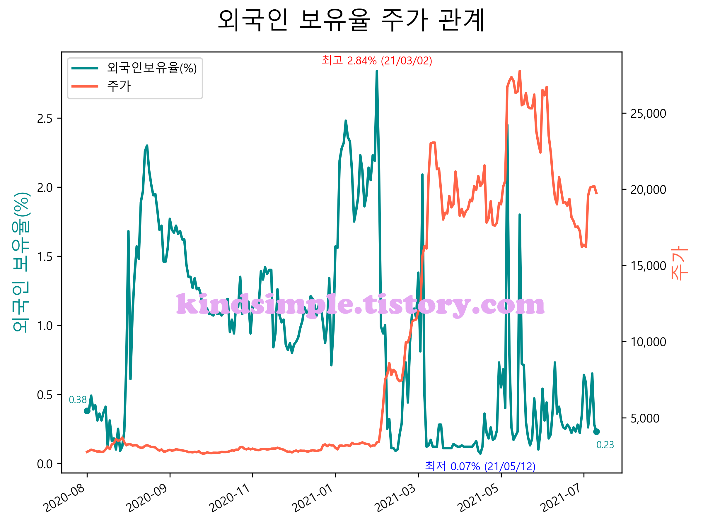 최근 1년간 외국인 보유율 및 주가와의 관계입니다.