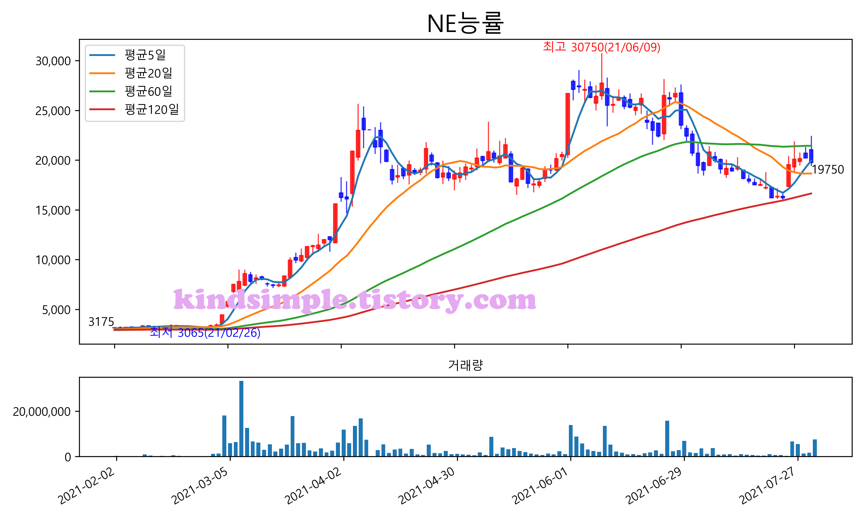 최근 6개월간 캔들차트 및 이동평균선입니다.