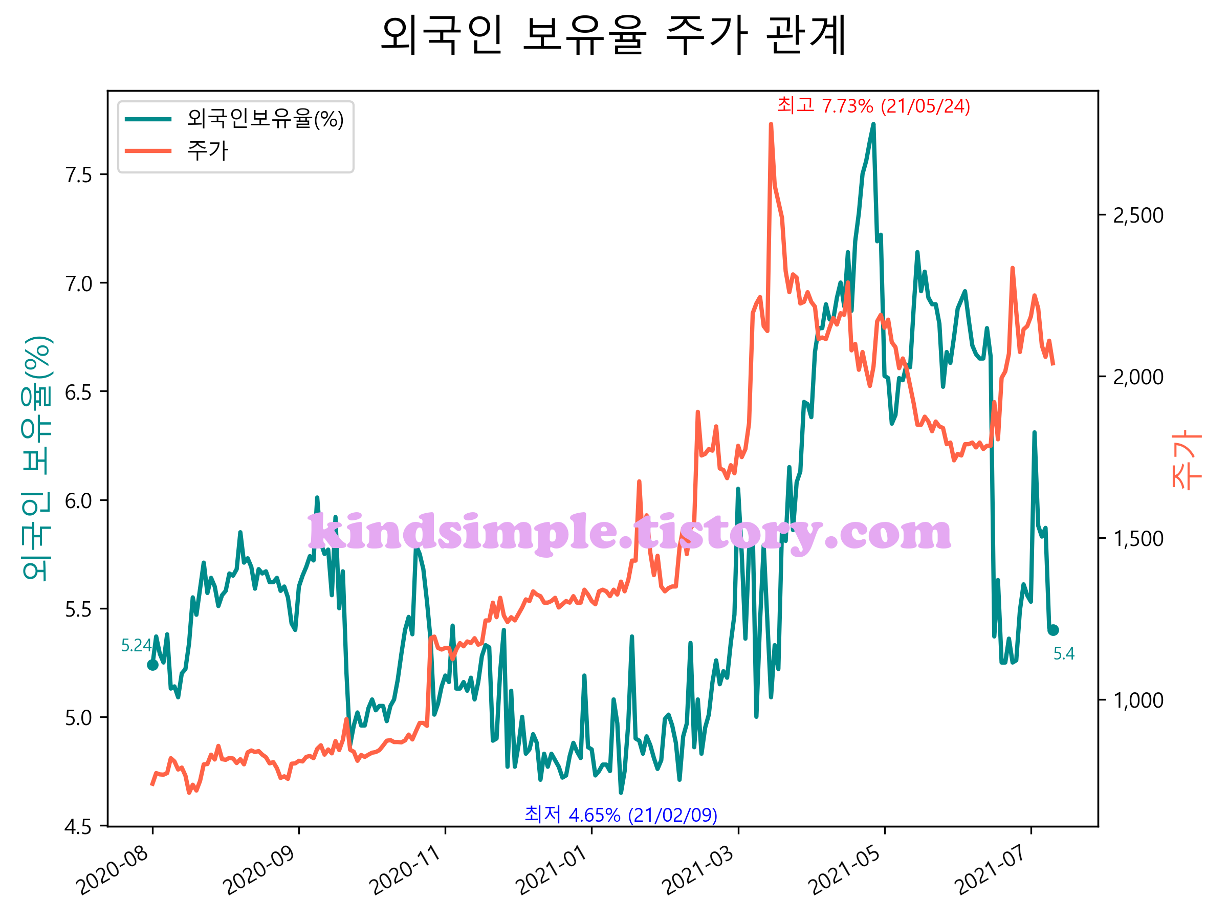 최근 1년간 외국인 보유율 및 주가와의 관계입니다.