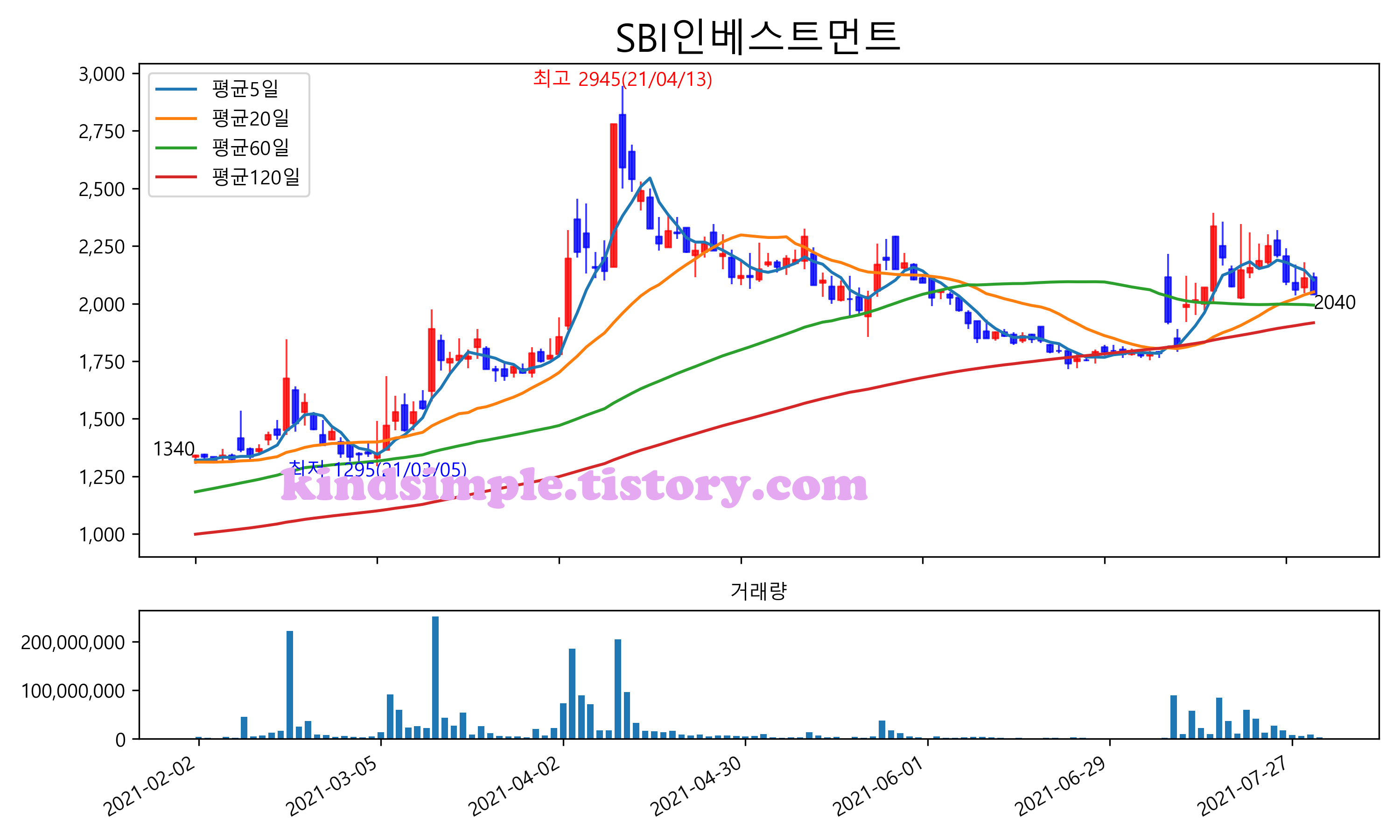 최근 6개월간 캔들차트 및 이동평균선입니다.