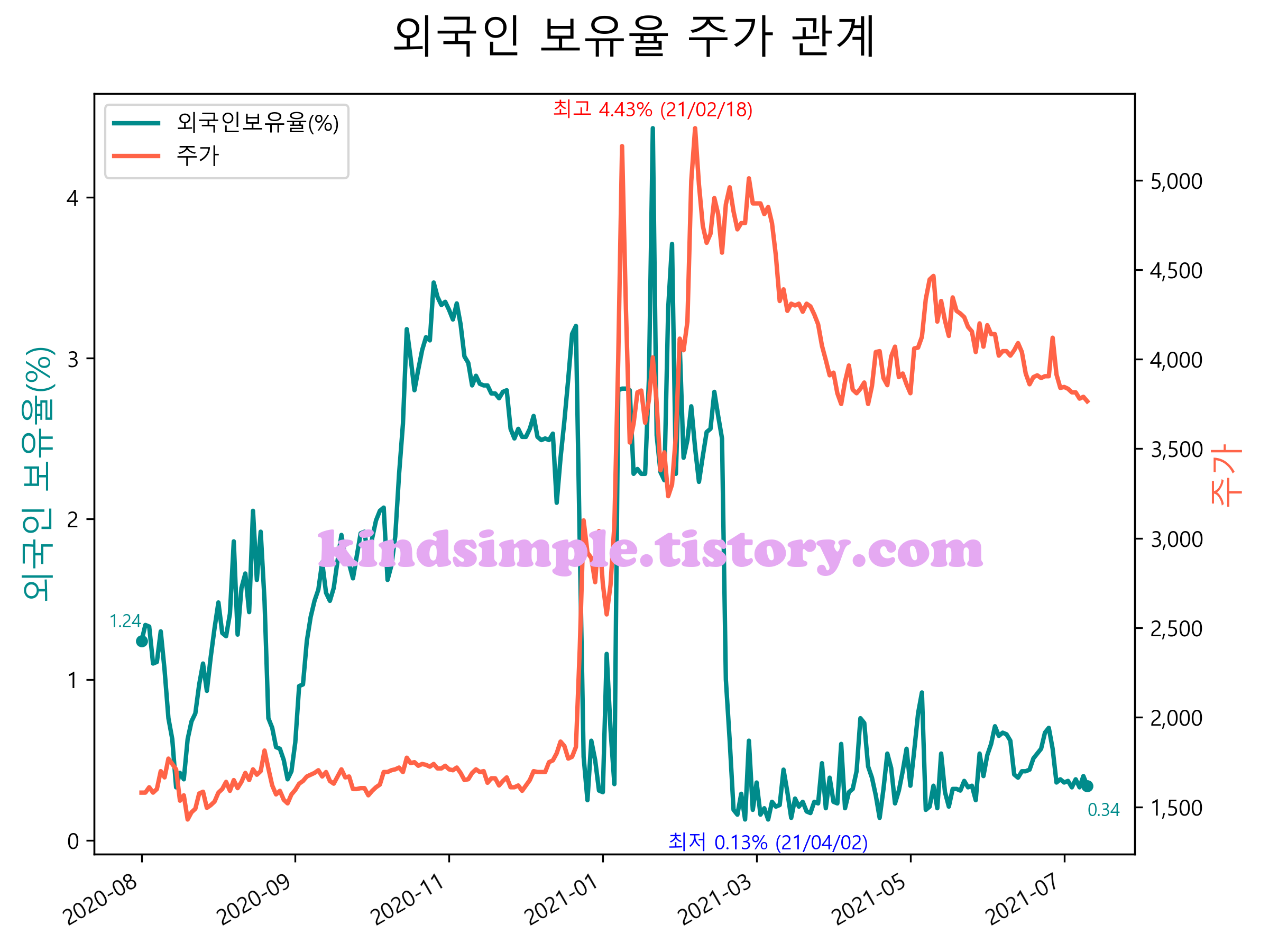 최근 1년간 외국인 보유율 및 주가와의 관계입니다.