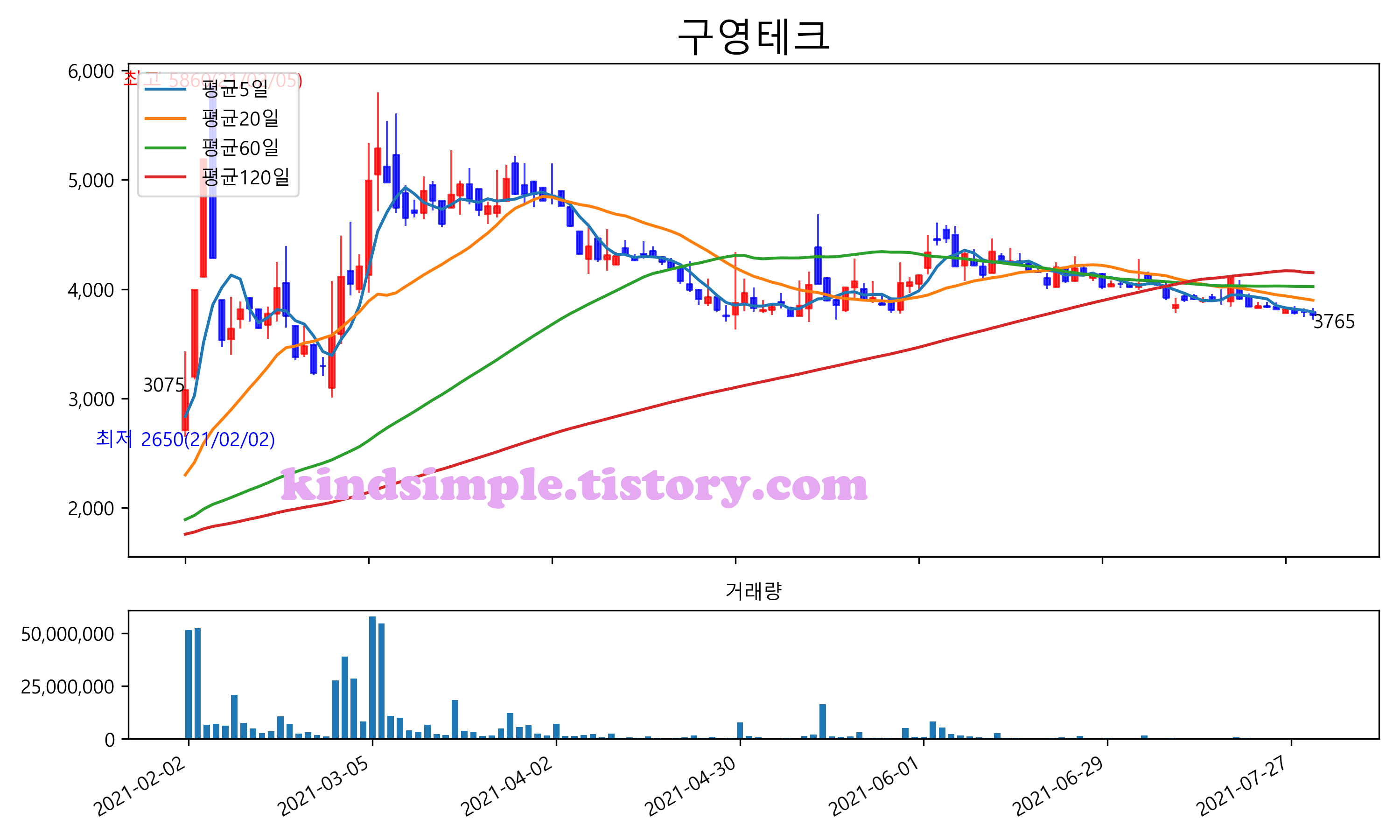 최근 6개월간 캔들차트 및 이동평균선입니다.