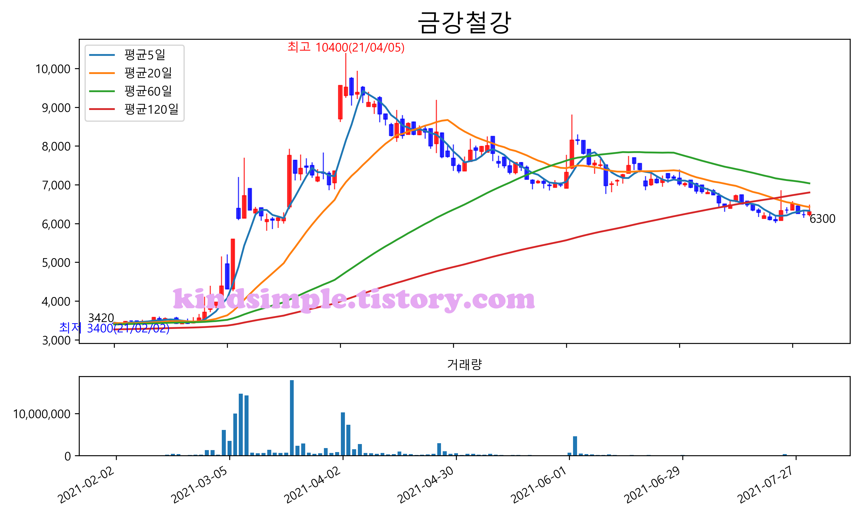 최근 6개월간 캔들차트 및 이동평균선입니다.