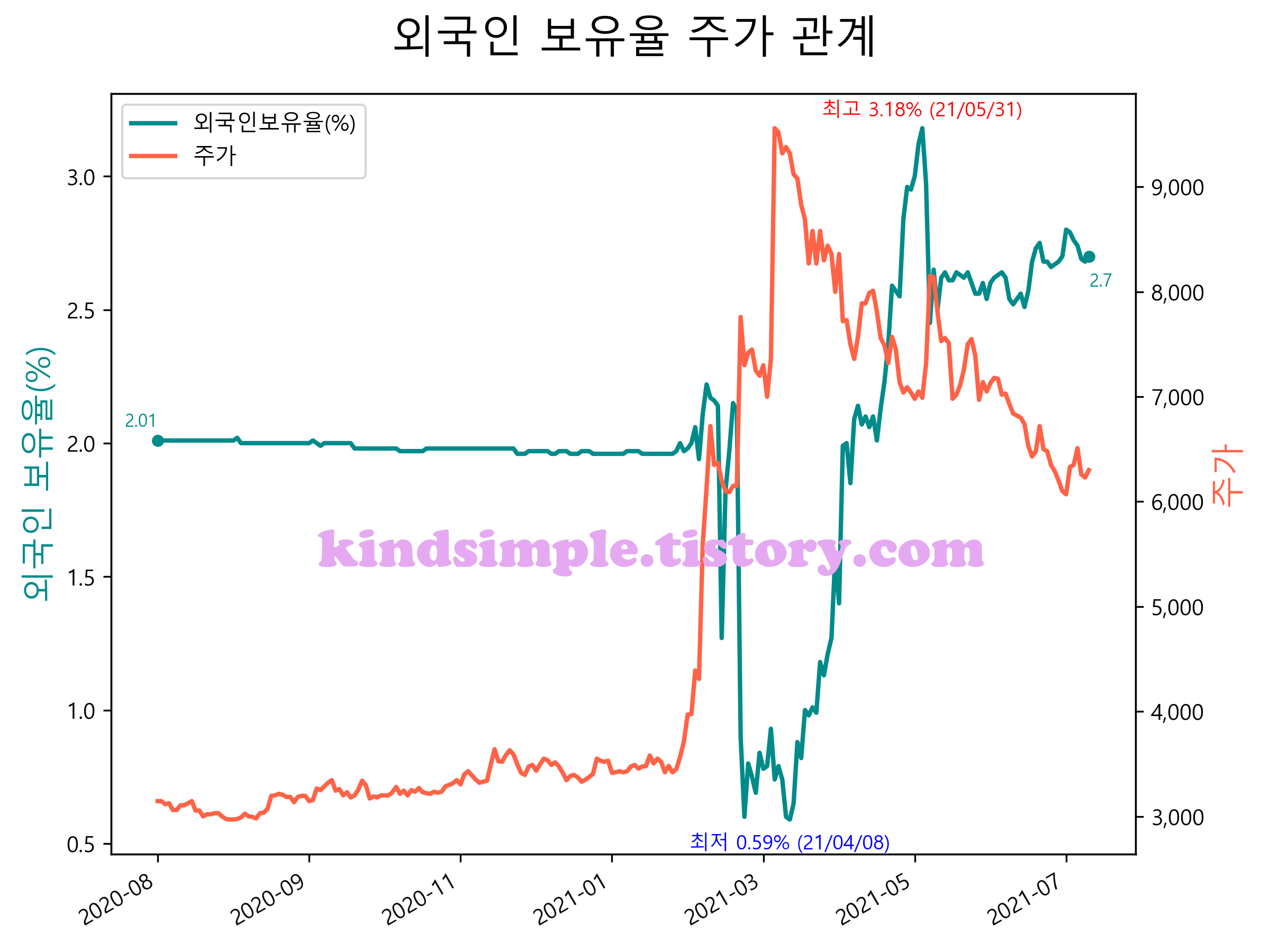 최근 1년간 외국인 보유율 및 주가와의 관계입니다.