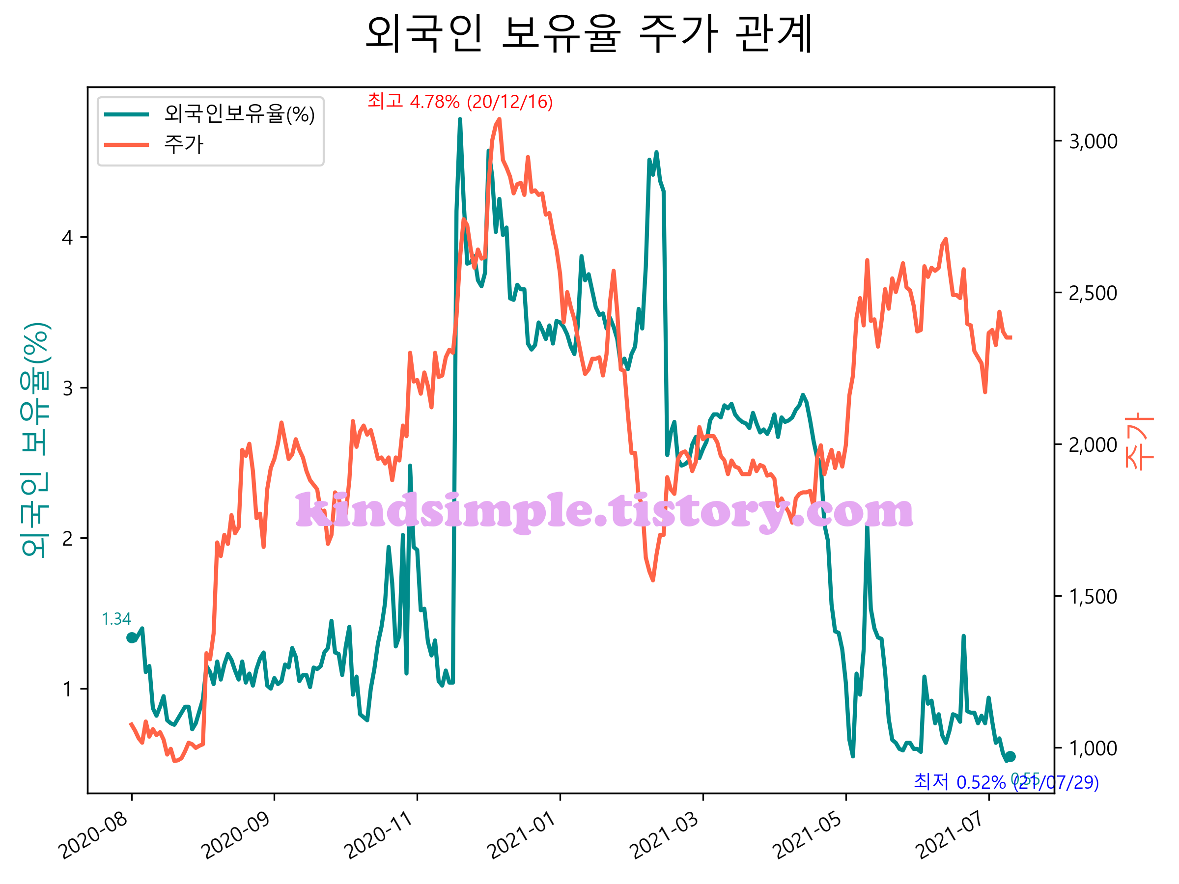 최근 1년간 외국인 보유율 및 주가와의 관계입니다.