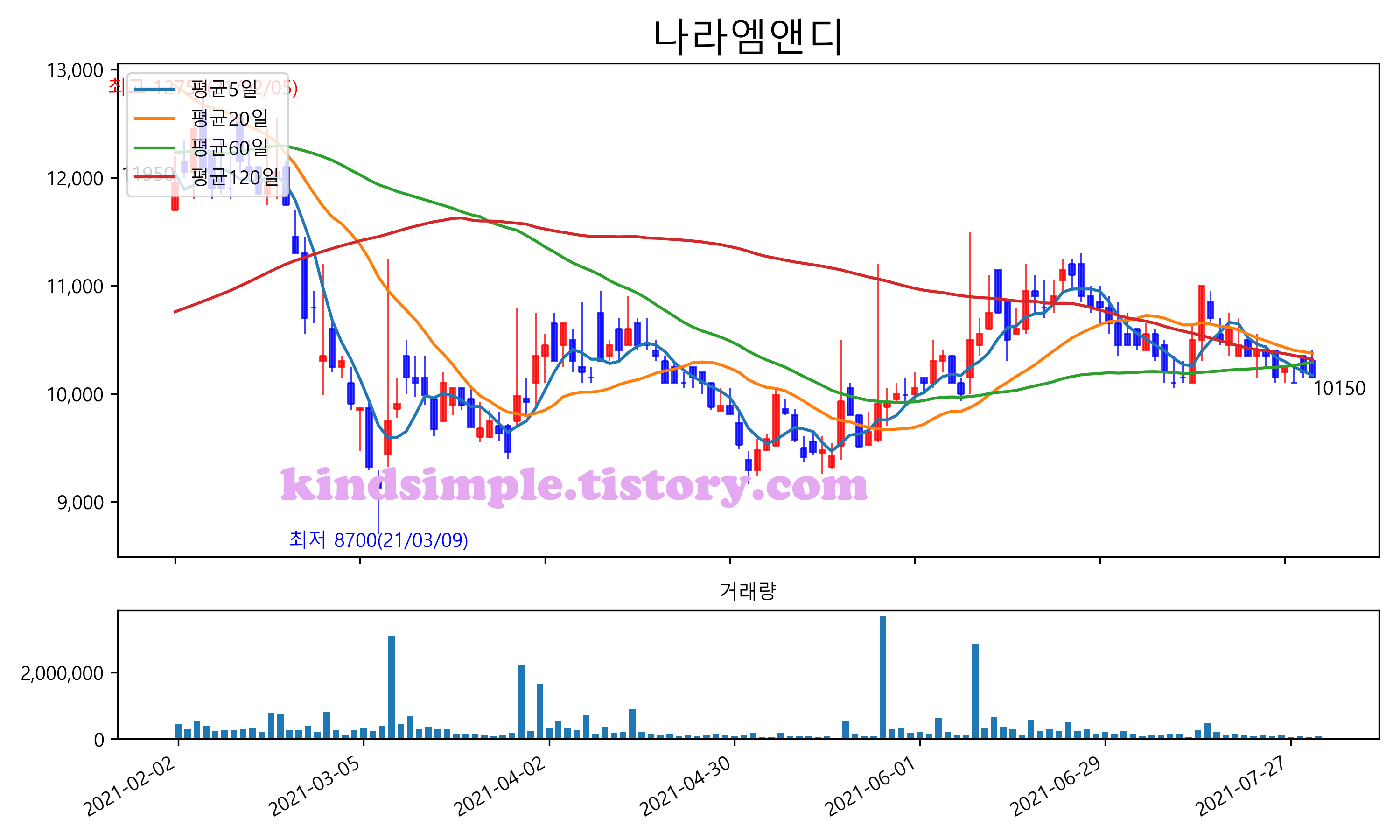 최근 6개월간 캔들차트 및 이동평균선입니다.