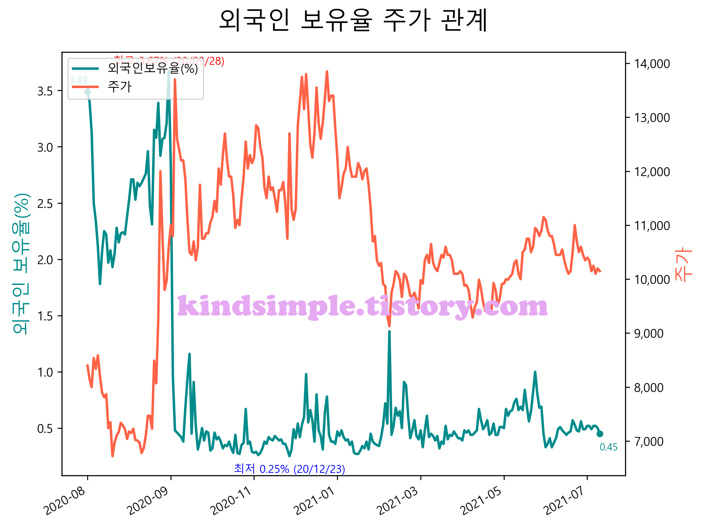 최근 1년간 외국인 보유율 및 주가와의 관계입니다.