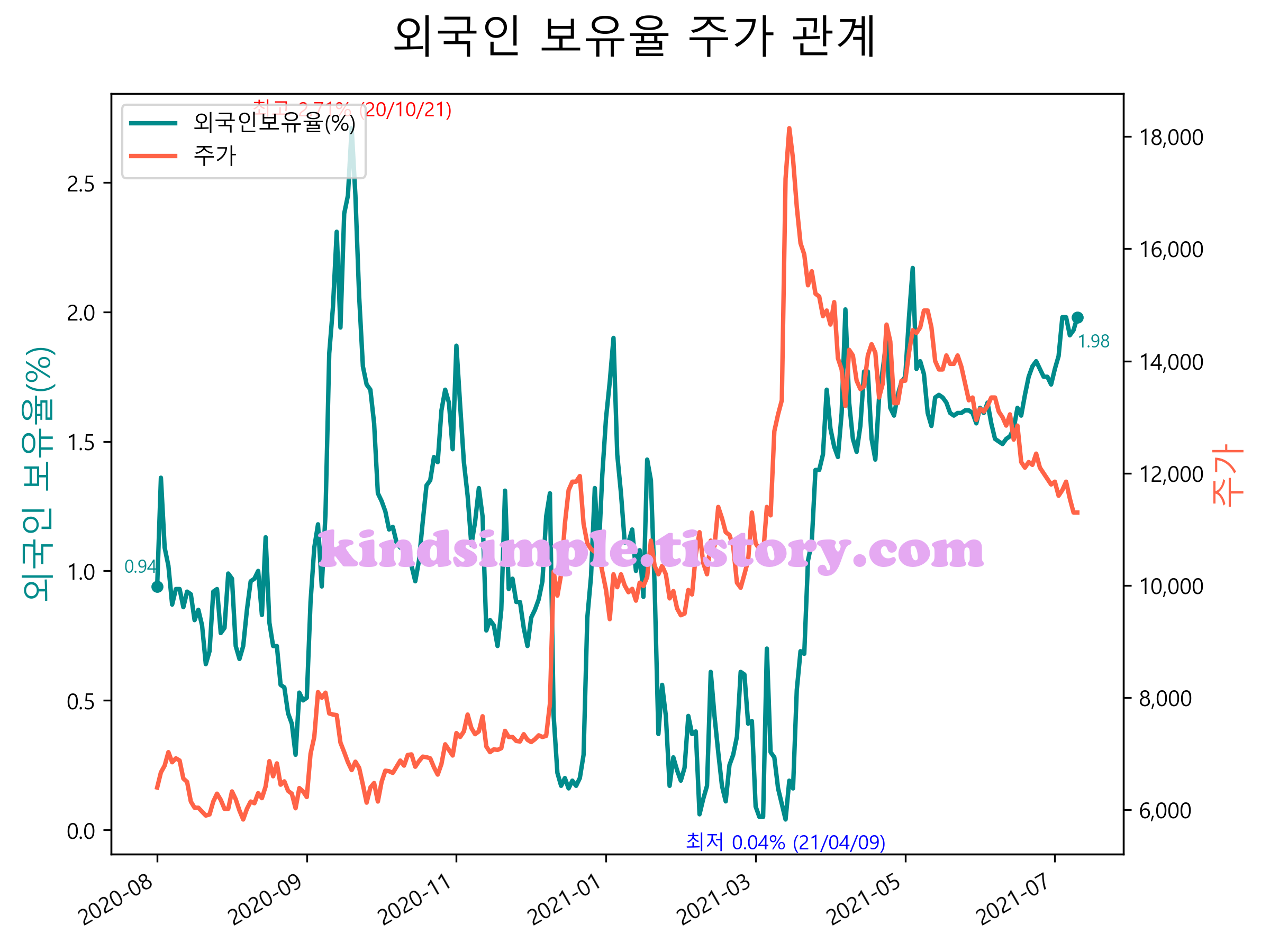 최근 1년간 외국인 보유율 및 주가와의 관계입니다.