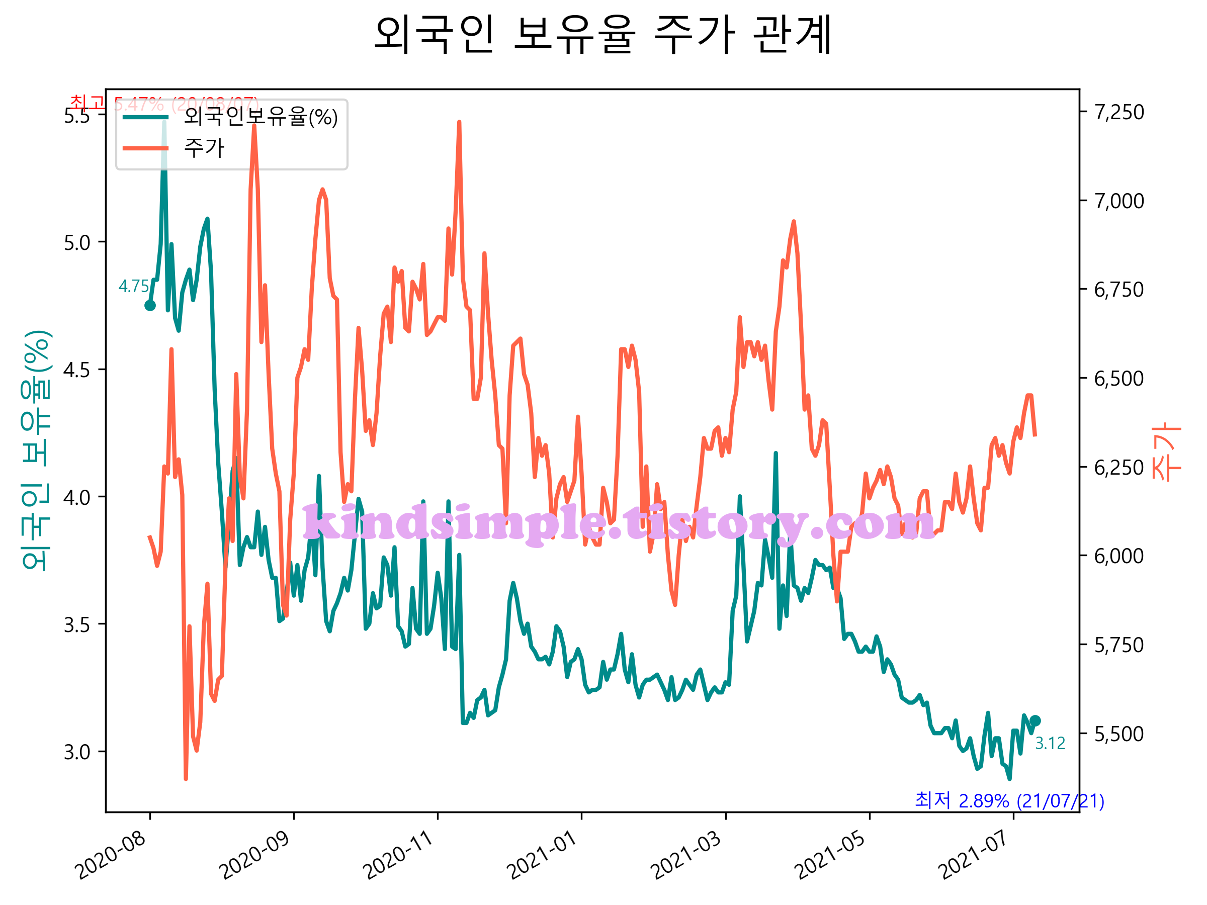 최근 1년간 외국인 보유율 및 주가와의 관계입니다.