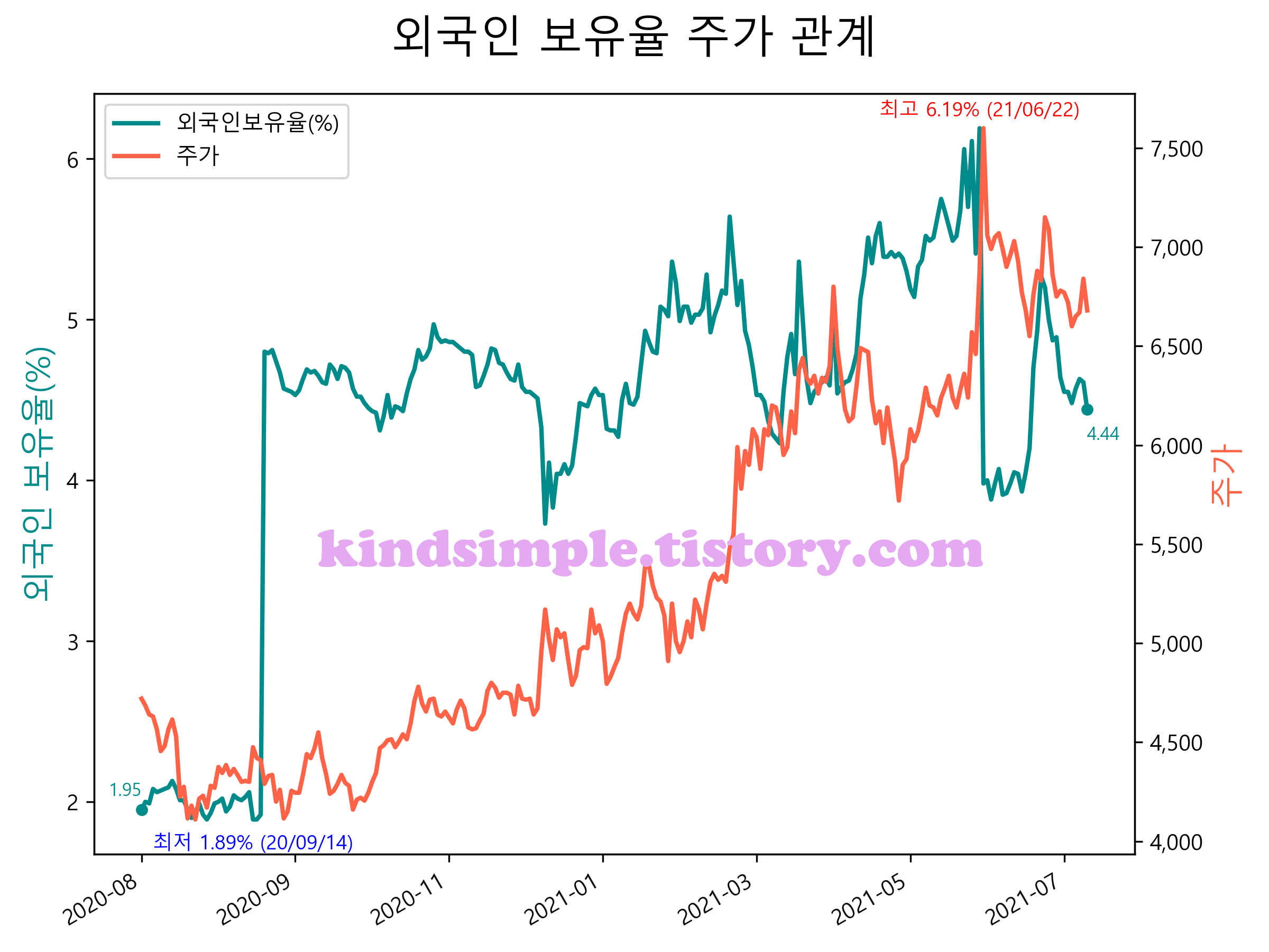 최근 1년간 외국인 보유율 및 주가와의 관계입니다.