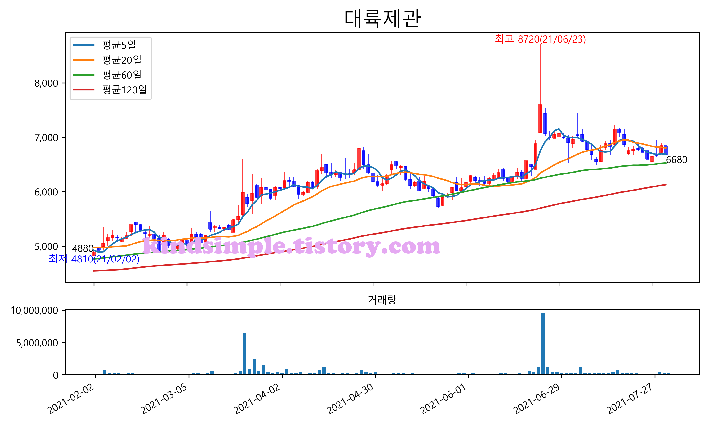 최근 6개월간 캔들차트 및 이동평균선입니다.